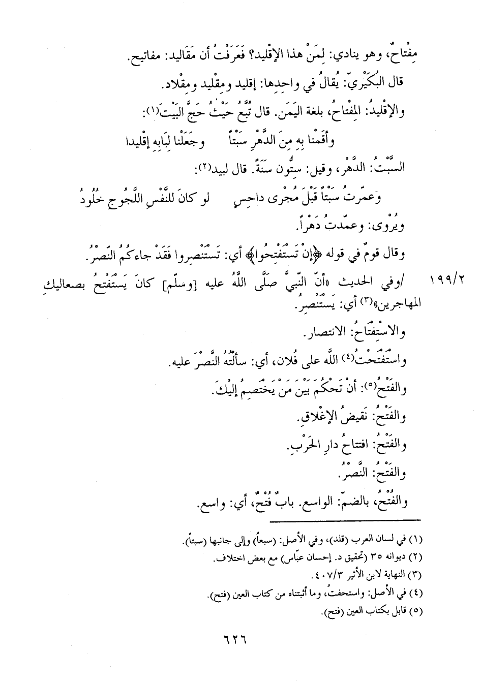 2/ 199 وفي الحديث "أنّ النبيَّ صلى اللهُ عليه [وسلم] كانَ يَسْتَفْتِحُ بصعاليكِ المهاجرين" أي: يَسْتَنْصِرُ.