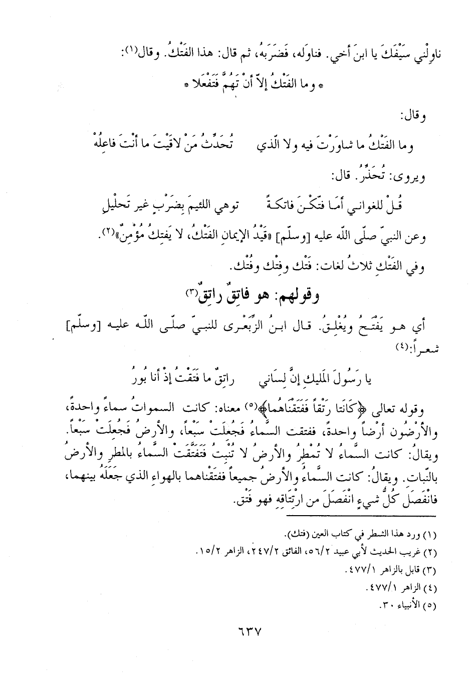 وقوله تعالى {كَانَتَا رَتْقاً فَفَتَقْنَاهُمَا} معناه: كانت السمواتُ سماءً واحدةً، والأرْضُون أرْضاً واحدةً، ففتقت السماءُ فَجُعِلَْ سَبْعاً، والأرضُ فَجُعِلَتْ سَبْعاً. ويقالُ: كانت السَّماءُ لا تُمْطِرُ والأرضُ لا تُنْبِتُ فَتَفَتَّقَتْ السَّماءُ بالمطرِ والأرضُ بالنّباتِ. ويقالُ: كانت السَّماءُ والأرضُ جميعاً ففتَقْناهما بالهواءِ الذي جَعَلَهُ بينهما، فانْفَصَل كُلُّ شيءٍ انْفَصَلَ من ارْتِتَاقِهِ فهو فَتْق.