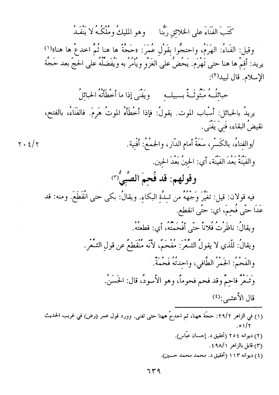 وقيل: الفَناءُ: الهَرَمُ، واحتجُّوا بِقَوْلِ عُمَرَ: "حَجَّةُ هاهنا ثُمَّ اخدعْ هاهنا" يريد: أقِمْ هاهنا حتى تَهْرَم. يَحُضُّ على الغَزْوِ ويْأمُرُ به ويُفَضْلُهُ على الحجّ بعد حَجَّة الإسلام. قال لبيد: