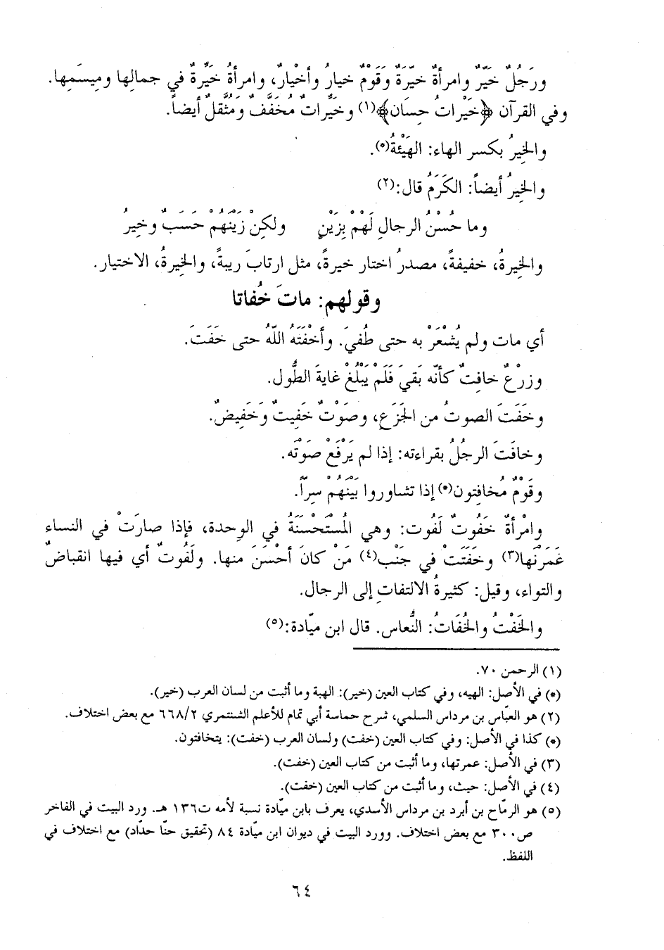 ورجلٌ خيرٌ وامرأةٌ خيرةٌ وقومٌ خيارُ وأخيارٌ، وامرأةُ خيرةٌ في جمالها وميسمها. وفي القرآن {خَيْرَاتٌ حِسَانٌ} وخيراتٌ مخففٌ ومثقلٌ أيضاً.