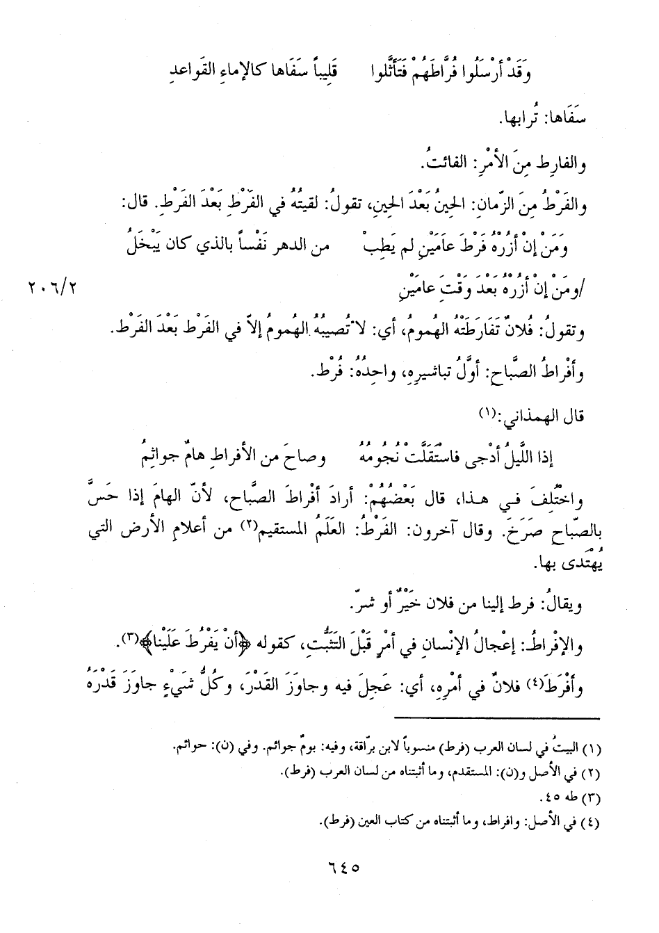واخْتُلِفَ في هذا، قال بعضُهُمْ: أرادَ أفْراطَ الصَّباح، لأنّ الهامَ إذا حَسَّ بالصّباح صَرَخَ. وقال آخرون: الفَرْطُ: العَلَمُ المستقيم من أعلامِ الأرض التي يُهْتَدى بها.