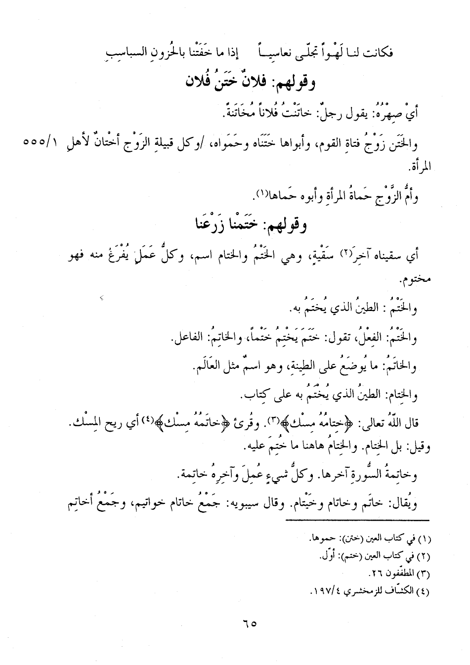 قال الله تعالى: {خِتَامُهُ مِسْكٌ}. وقرئ {خَاتَمُهُ مِسْكٌ} أي ريح المسك. وقيل: بل الختام. والخِتَامُ هاهنا ما خُتِمَ عليه.