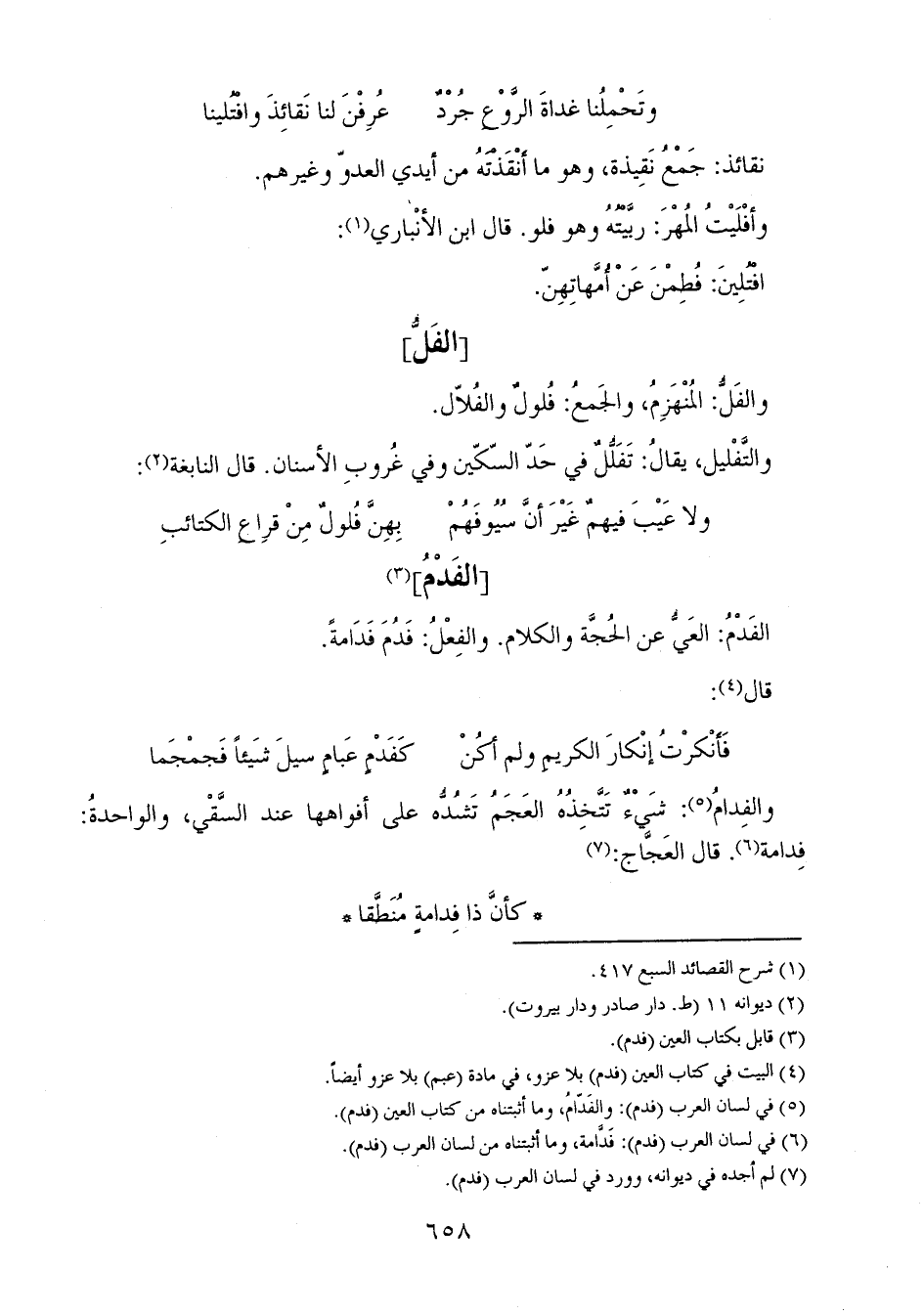والفِدامُ: شَيْءٌ تَتَّخِذُهُ العَجَمُ تَشُدُّه على أفواهها عند السَّقْي، والواحدةُ: فِدامة. قال العجاج: