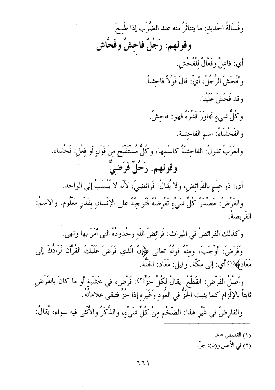وفَرَضَ: أوْجَبَ، ومِنْهُ قولُهُ تعالى {إِنَّ الَّذِي فَرَضَ عَلَيْكَ الْقُرْآنَ لَرَادُّكَ إِلَى مَعَادٍ} أي: إلى مكّة. وقيل: مَعَاد: الجَنَّة.