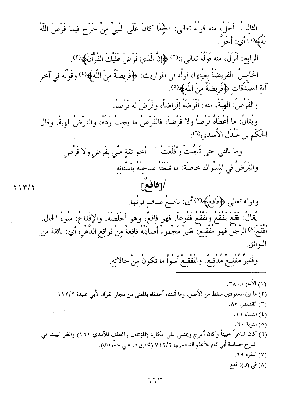 الخامسُ: الفريضَةُ بِعَيْنِها، قولُه في المواريث: {فَرِيضَةً مِنْ اللَّهِ} وقولُه في آخر آيةِ الصَّدَقاتِ {فَرِيضَةً مِنْ اللَّهِ}.