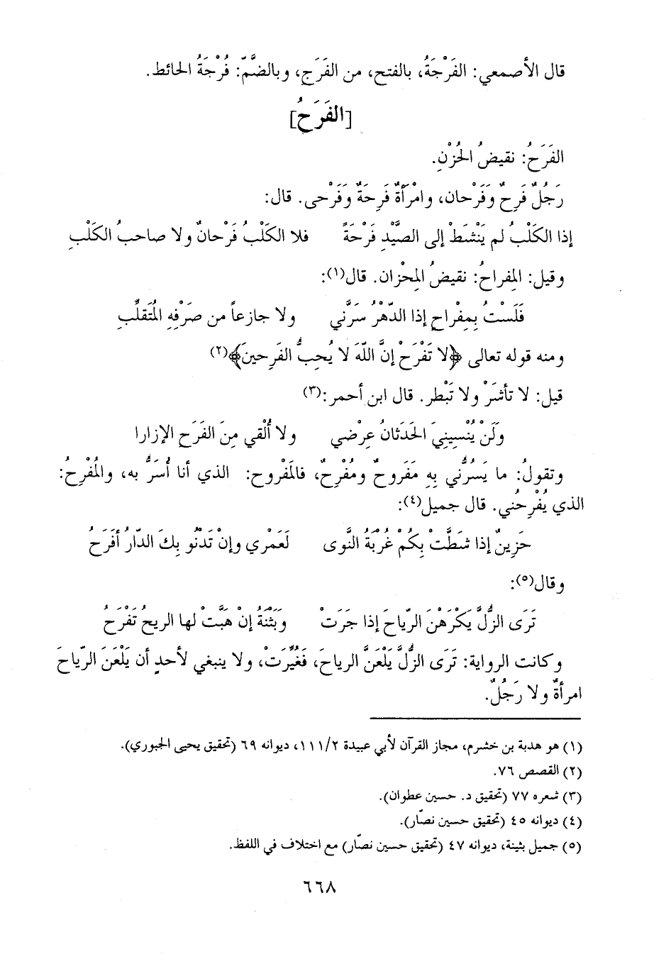 وتقولُ: ما يَسُرُّني بِهِ مَفَروحٌ ومُفْرِحٌ، فالمَفْروح: الذي أنا أُسَرُّ به، والمُفْرِحُ: الذي يُفْرِحُني. قال جميل: