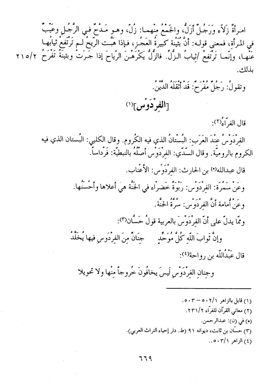 الفِرْدَوْسُ عِنْدَ العَرَبِ: البُسْتانُ الذي فيه الكُروم. وقال الكلبي: البُستان الذي فيه الكروم بالروميّة. وقال السّدِّي: الفِرْدَوْس أصْلُهُ بالنبطيّة: فَرْداساً.