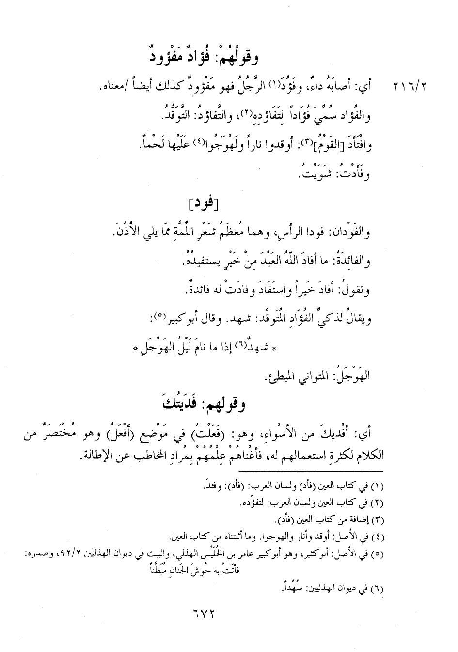 أي: أصابَهُ داءٌ، وفَؤُدَ الرَّجُلُ فهو مَفْؤودٌ كذلك أيضاً 2/ 216 معناه.