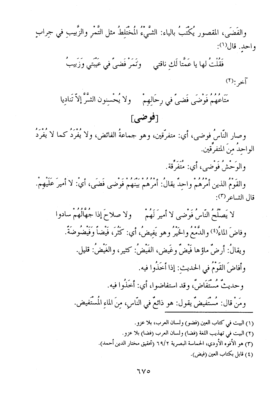 وصار النّاسُ فوضى، أي: متفرقين، وهو جماعةُ الفائض، ولا يُفْرَدُ كما لا يُفْرَدُ الواحِدُ مِنَ المتفرِّقين.