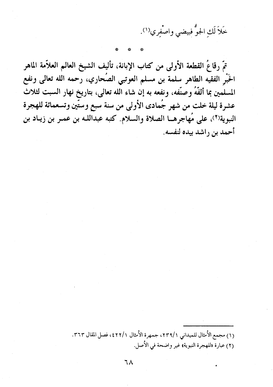 تم رقاعُ القطعة الأولى من كتاب الإبانة، تأليف الشيخ العالم العلامة الماهر الحَبْرِ الفقيه الطاهر سلمة بن مسلم العوتبي الصُحاري، رحمه الله تعالى ونفع المسلمين بما ألفه وصنفه، ونفعه به إن شاء الله تعالى، بتاريخ نهار السبت لثلاث عشرة ليلة خلت من شهر جُمادى الأولى من سنة سبع وستين وتسعمائة للهجرة النبوية، على مُهاجرها الصلاة والسلام. كتبه عبد الله بن عمر بن زياد بن أحمد بن راشد بيده لنفسه.