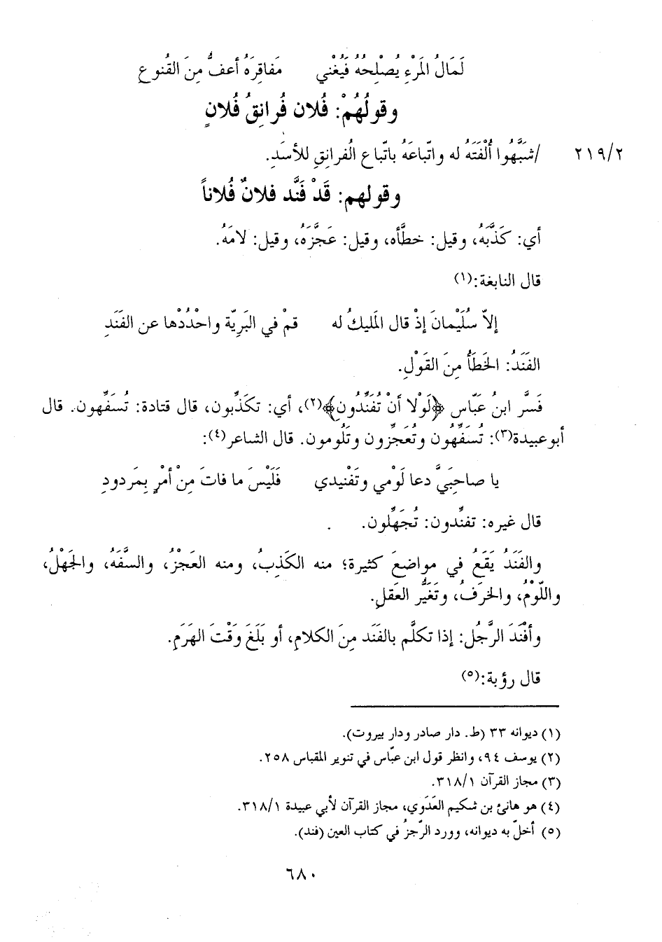 فَسَّر ابنُ عَبّاس {لَوْلا أَنْ تُفَنِّدُونِ}، أي: تكَذِّبون، قال قتادة: تُسَفِّهون. قال أبو عبيدة: تُسَفِّهُون وتُعَجِّزون وتَلُومون. قال الشاعر: