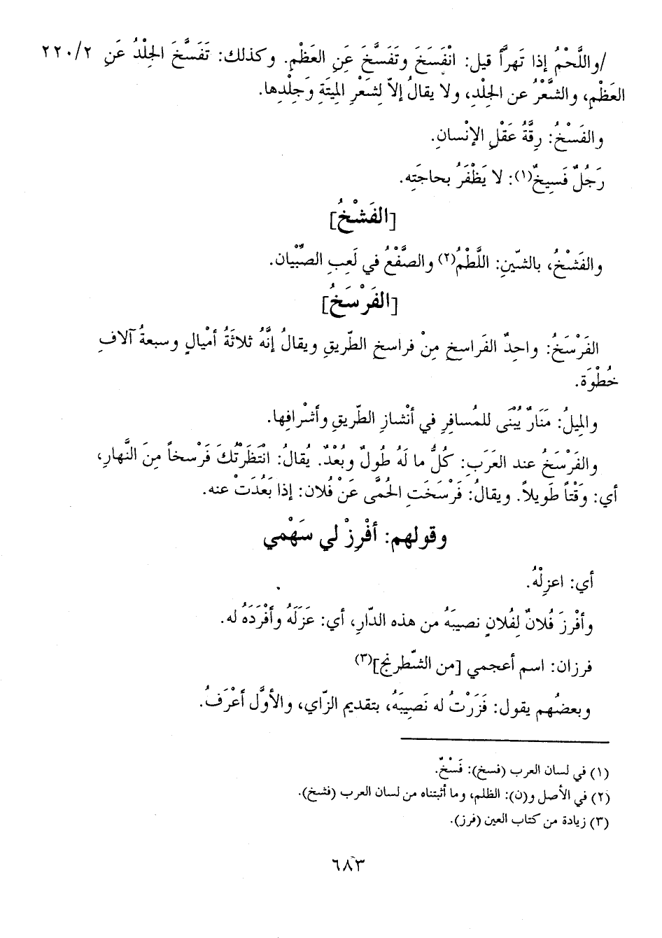 2/ 220 واللَّحْمُ إذا تَهرَّأ قيل: انْفَسَخَ وتَفَسَّخَ عِنِ العَظْمِ. وكذلك: تَفَسَّخَ الجِلْدُ عَنِ العَظْمِ، والشَّعْرُ عن الجِلْدِ، ولا يقالُ إلا لِشَعْرِ المِيتَةِ وجِلْدِها.