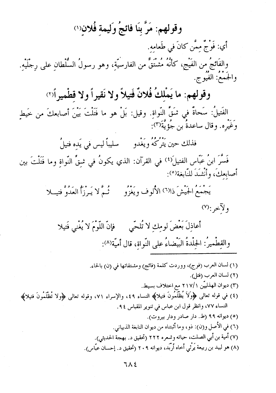 فسَّرَ ابنُ عباس الفتيلَ في القرآن: الذي يكونُ في شِقَّ النّواةِ وما فَتَلْتَ بين أصابِعِكَ، وأنْشد للنابغة: