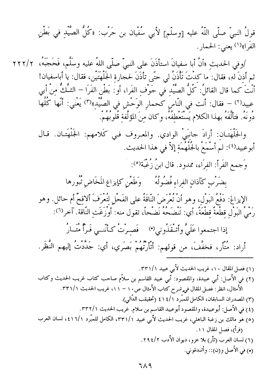 2/ 222 وفي الحديث "أنَّ أبا سفيانَ أستأذَنَ على النبي صلى الله عليه وسلم، فحَجَبَهُ، ثم أذِنَ له، فقال: ما كِدْتَ تَأذَنُ لي حتى تأذَنّ لحجارةِ الجَلْهَتَيْن، فقال: يا أبا سفيان! أنتَ كما قال القائلُ: كُلُّ الصَّيْدِ في جَوْفِ الفَرا، أو: بَطْن الفَرَا - الشَّكُّ مِنْ أبي عبيد- فقال: أنت في الناس كحمارِ الوََحْشِ في الصَّيْدِ" يعني: أنّها كُلَّها دُونَهُ. فتألَّفَهُ بهذا الكلام يَسْتَعْطِفُهُ، وكان مِنَ المؤلَّفةِ قُلوبُهُمْ.