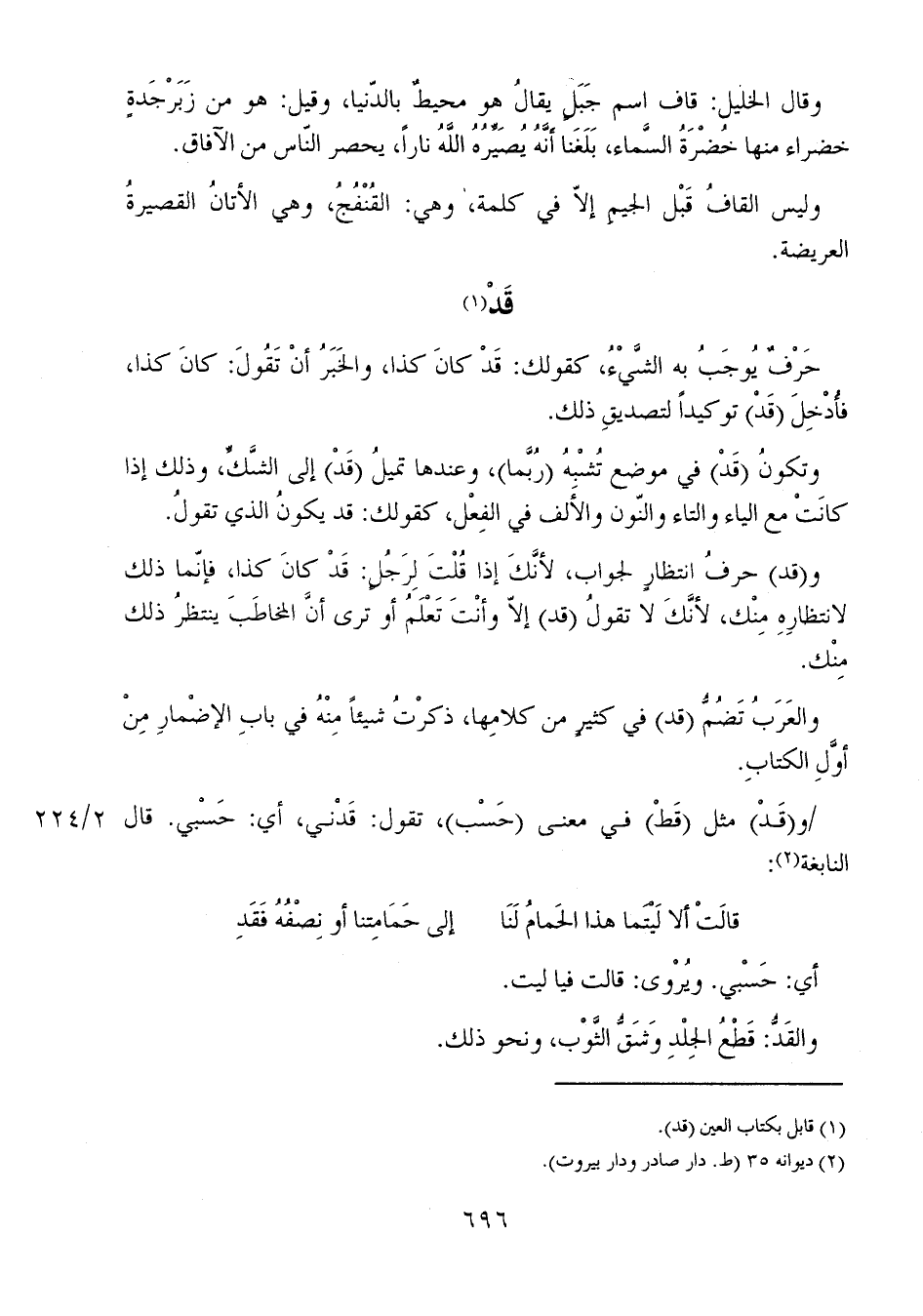 2/ 224 و (قَدْ) مثل (قَطْ) في معنى (حَسْب)، تقول: قَدْني، أي: حَسْبي. قال النابغة: