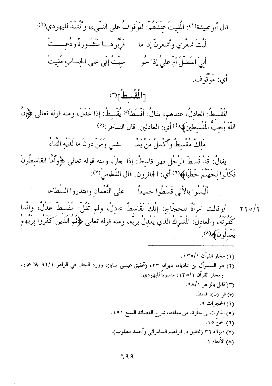 2/ 225 وقالت امرأةٌ للحجاج: إنَّكَ لقَاسِطٌ عادِلٌ، ولم تَقُلْ: مُقْسِطٌ عَدْلٌ، وإنَّما كَفَّرَتْهُ، والعادِلُ: المُشْرِكُ الذي يَعْدِلُ بربّه، ومنه قوله تعالى {ثُمَّ الَّذِينَ كَفَرُوا بِرَبِّهِمْ يَعْدِلُونَ}.