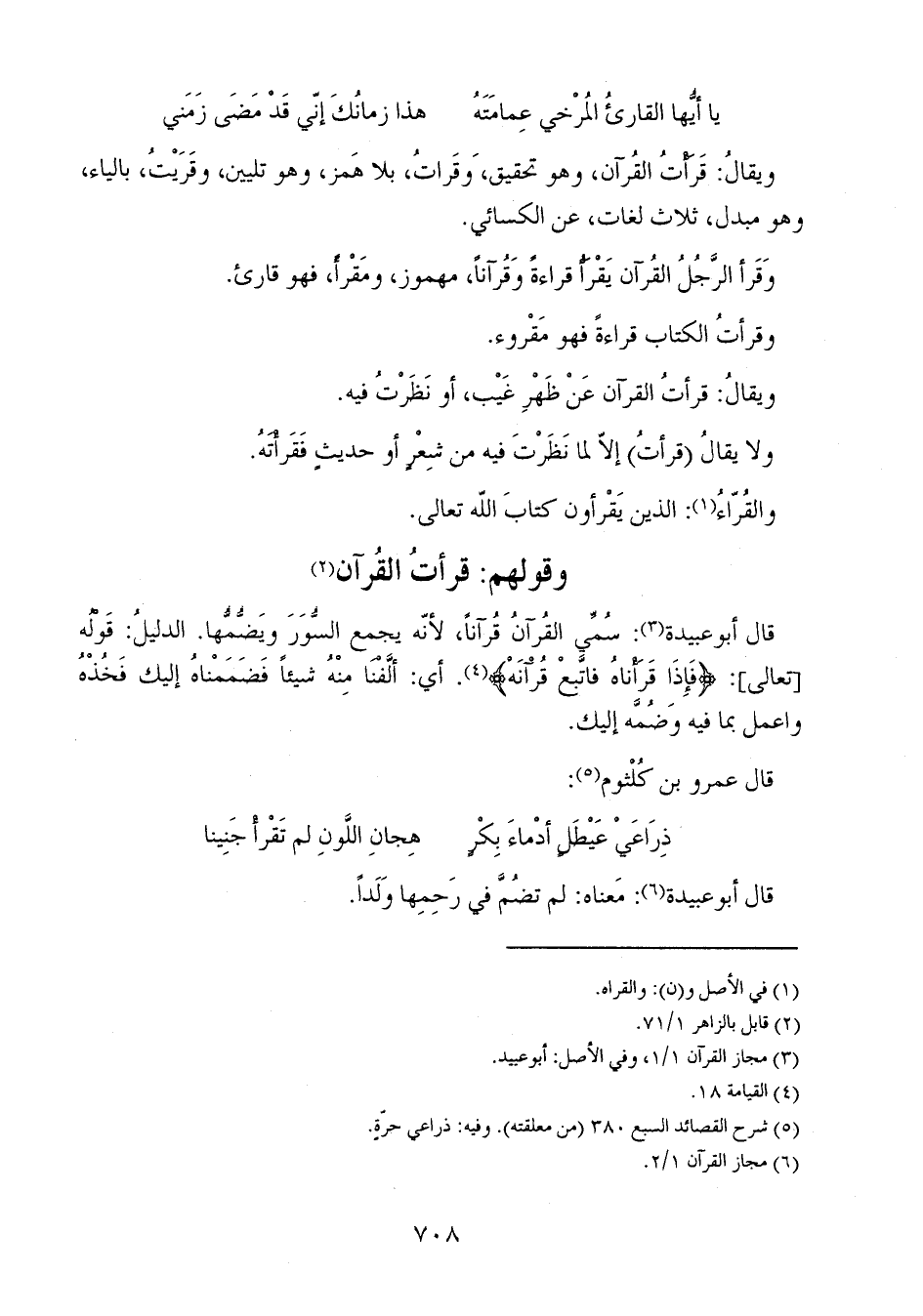 قال أبو عبيدة: سُمِّي القُرآنُ قُرآناً، لأنّه يجمع السُّوَرَ ويضُّمُّها. الدليلُ: قَوْلُه [تعالى]: {فَإِذَا قَرَانَاهُ فَاتَّبِعْ قُرْآنَهُ}. أي: ألَّفْنَا مِنْهُ شيئاً فضَمَمْناهُ إليك فَخُذْهُ واعمل بما فيه وضُمَّه إليك.