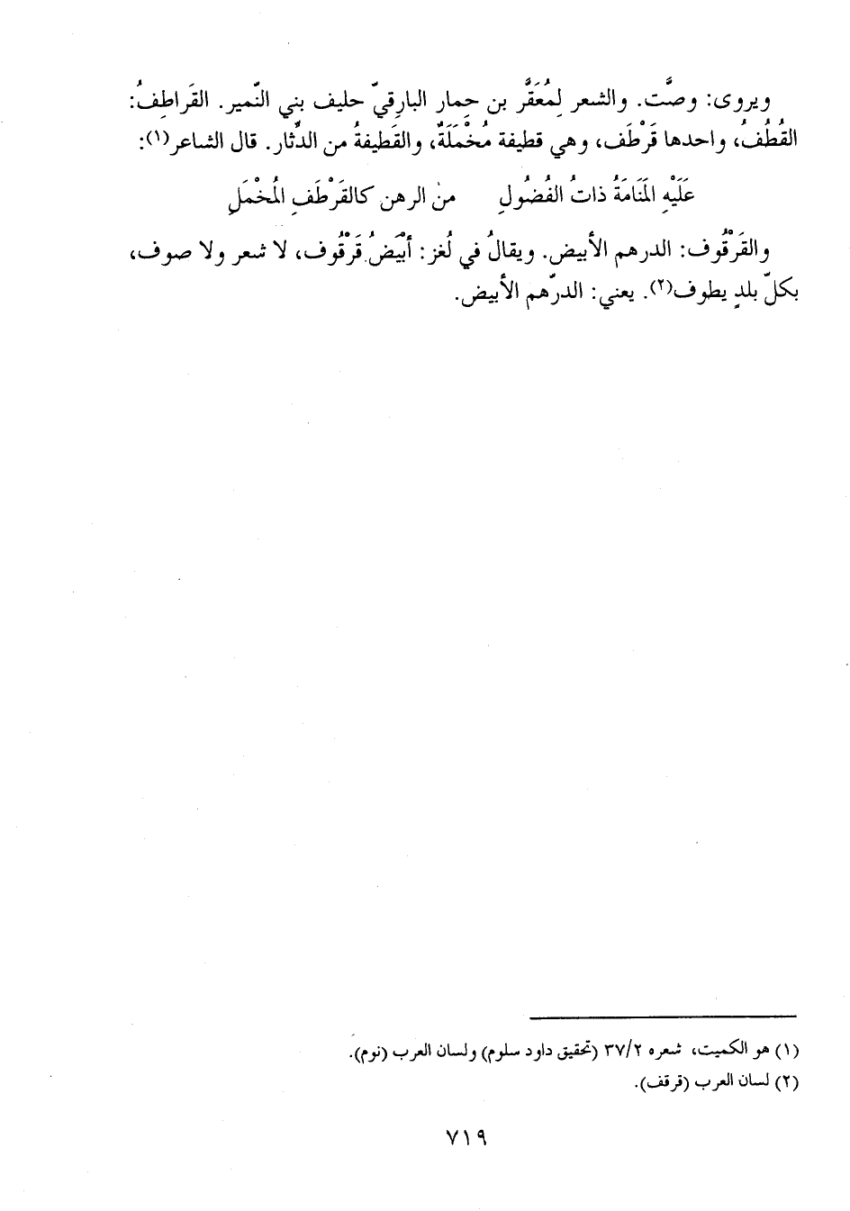 ويروى: وصَّت. والشعر لِمُعَقَّر بن حمار البارِقيّ حليف بني النّمير. القَراطِفُ: القُطُفُ، واحدها قَرْطَف، وهي قطيفة مُخْمَلَةٌ، والقَطيفةُ من الدثار. قال الشاعر: