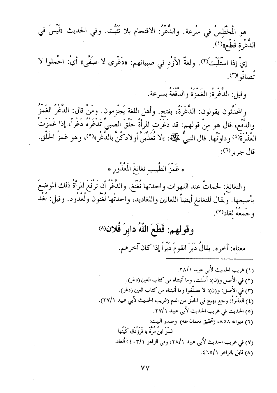 والمحدثون يقولون: الدَّغَرَةُ، بفتح. وأهل اللغة يجزمون. ومَنْ قال: الدَّغْرُ الغَمْزُ والدَّفْع، قال هو مِنْ قولهم: قد دَغَرَت المرأةُ حَلْقَ الصبي تَدْغَرُهُ دغْراً، إذا غَمَزَتْ العُذْرَةَ وداوَتْها. قال النبي صلى الله عليه وسلم:"لا تُعَذِّبَنَّ أولادكُنَّ بالدَّغْر"، وهو غمزُ الحَلْق. قال جرير: