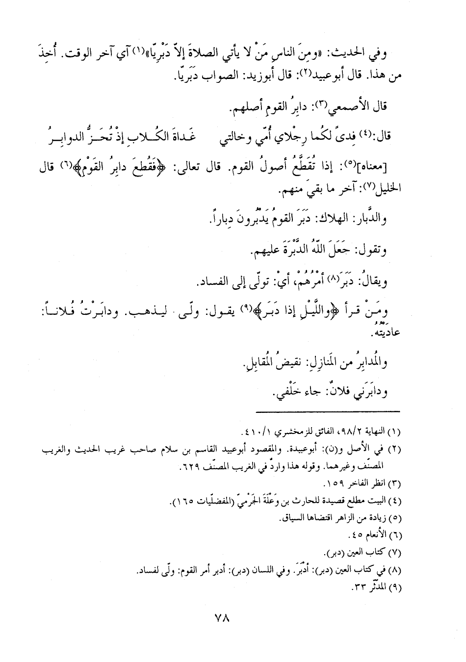 وفي الحديث: "ومِنَ الناسِ مَنْ لا يأتي الصلاة إلا دَبْرِيا" آي آخر الوقت. أُخِذَ من هذا. قال أبو عبيد: قال أبو زيد: الصواب دبرياً.
