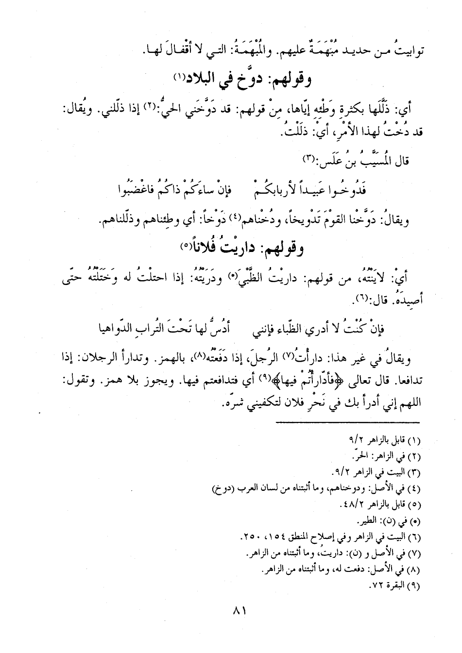 ويقال في غير هذا: دارأتُ الرجل، إذا دفعتُه، بالهمز. وتدارأ الرجلان: إذا تدافعا. قال تعالى {فَادَّارَاتُمْ فِيهَا} أي فتدافعتم فيها. ويجوز بلا همز. وتقول: اللهم إني أدرأ بك في نحر فلان لتكفيني شره.