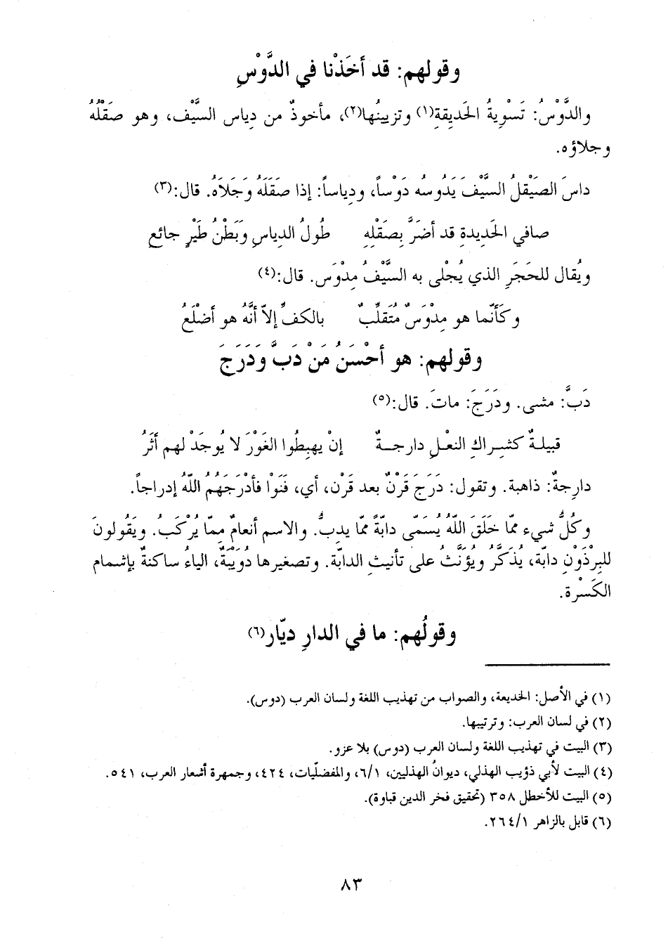 وكل شيء مما خلق الله يسمى دابة مما يدبُّ. والاسم أنعامٌ مما يُركبُ. ويقولون للبرذون دابة، يُذكر ويؤنث على تأنيث الدابة. وتصغيرها دويبة، الياء ساكنة بإشمام الكسرة.