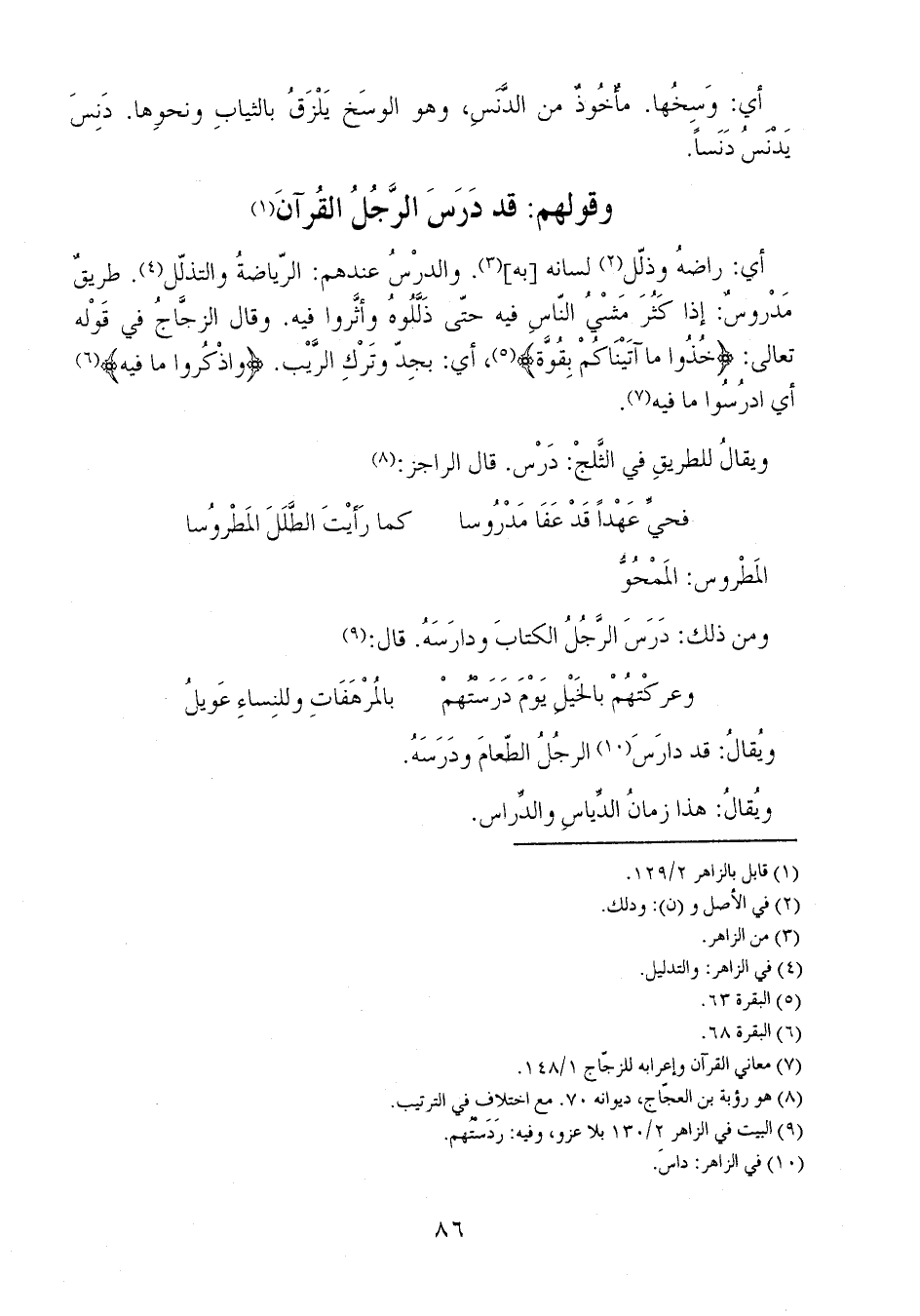 أي: راضهُ وذلل لسانه [به]. والدرسُ عندهم: الرياضة والتذلل. طريق مدروس: إذا كثرَ مشيُ الناس فيه حتى ذللوه وأثروا فيه. وقال الزجاج في قوله تعالى: {خُذُوا مَا آتَيْنَاكُمْ بِقُوَّةٍ}، أي: بجدَ وترْكِ الريب. {وَاذْكُرُوا مَا فِيهِ} أي ادرسوا ما فيه.
