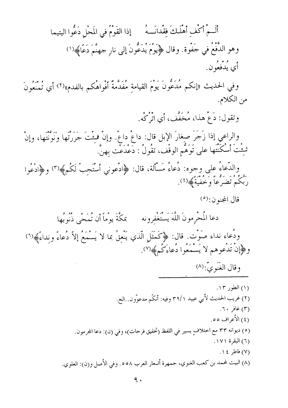 ودعاء نداء صوت. قال: {كَمَثَلِ الَّذِي يَنْعِقُ بِمَا لا يَسْمَعُ إِلاَّ دُعَاءً وَنِدَاءً} و {إِنْ تَدْعُوهُمْ لا يَسْمَعُوا دُعَاءَكُمْ}.