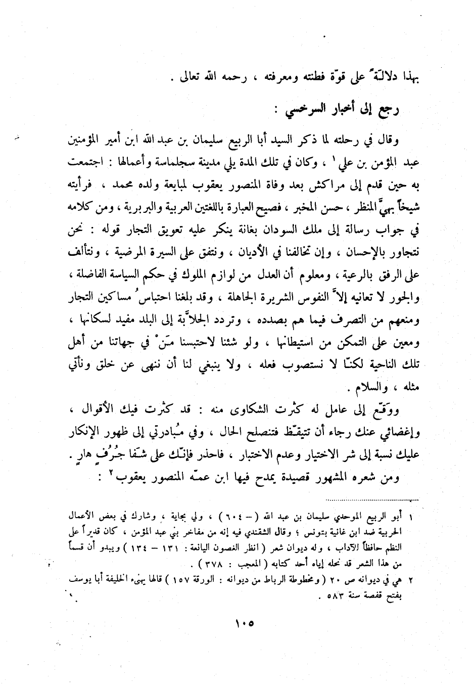 وقال في رحلته لما ذكر السيد أبا الربيع سليمان بن عبد الله أمير المؤمنين عبد المؤمن بن علي (1) ، وكان في تلك المدة يلي مدينة سجلماسة وأعمالها: اجتمعت به حين قدم إلى مراكش بعد وفاة المنصور يعقوب لمبايعة ولده محمد، فرأيته شيخاً بهي المنظر، حسن المخبر، فصيح العبارة باللغتين العربية والبربرية، ومن كلامه في جواب رسالة إلى ملك السودان بغانة ينكر عليه تعويق التجار قوله: نحن نتجاور بالإحسان، وإن تخالفنا في الأديان، ونتفق على السيرة المرضية، ونتألف على الرفق بالرعية، ومعلوم أن العدل من لوازم الملوك في حكم السياسة الفاضلة، والجور لا تعانيه إلا النفوس الشريرة الجاهلة، وقد بلغنا احتباس مساكين التجار ومنعهم من التصرف فيما هم بصدده، وتردد الجلابة إلى البلد مفيد لسكانها، ومعين على التمكن من استيطانها، ولو شئنا لاحتبسنا من في جهاتنا من أهل تلك الناحية لكنا لا نستصوب فعله، ولا ينبغي لنا أن ننهى عن خلق ونأتي مثله، والسلام.