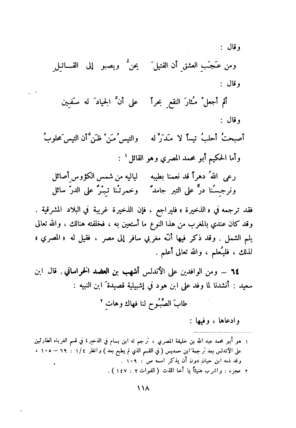 ونرجسنا درٌ على التبر جامدٌ ... وخمرتنا تبرٌ على الدرّ سائل فقد ترجمه في " الذخيرة " فليراجع، فإن الذخيرة غريبة في البلاد المشرقية.