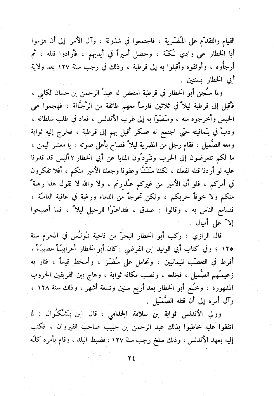 القيام والتقدم على المضرية، فاجتمعوا في شذونة، وآل الأمر إلى أن هزموا أبا الخطار على وادي لكة، وحصل أسيراً في أيديهم، فأرادوا قتله، ثم أرجأوه، وأوثقوه وأقبلوا به إلى قرطبة، وذلك في رجب سنة 127 بعد ولاية أبي الخطار بسنتين.