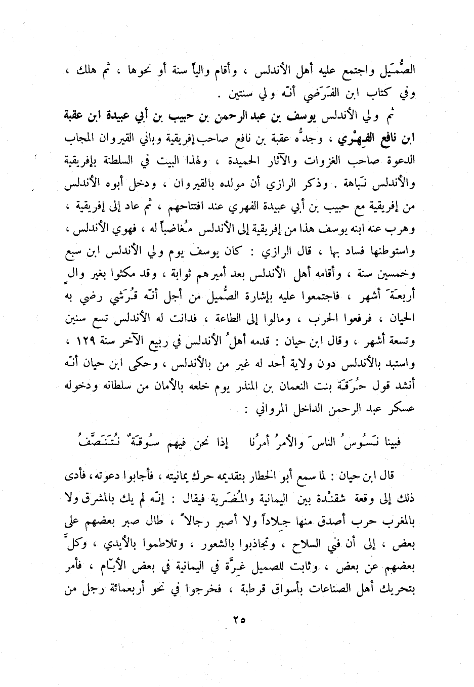 ثم ولي الأندلس يوسف بن عبد الرحمن بن حبيب بن أبي عبيدة ابن نافع الفهري، وجده عقبة بن نافع صاحب إفريقية وباني القيروان المجاب الدعوة صاحب الغزوات والآثار الحميدة، ولهذا البيت في السلطنة بإفريقية والأندلس نباهة. وذكر الرازي أن مولده بالقيروان، ودخل أبوه الأندلس من إفريقية مع حبيب بن أبي عبيدة الفهري عند افتتاحهم، ثم عاد إلى إفريقية، وهرب عنه ابنه يوسف هذا من إفريقية إلى الأندلس مغاضباً له، فهوي الأندلس، واستوطنها فساد بها، قال الرازي: كان يوسف يوم ولي الأندلس ابن سبع وخمسين سنة، وأقامه أهل الأندلس بعد أميرهم ثوابة، وقد مكثوا بغير والٍ أربعة أشهر، فاجتمعوا عليه بإشارة الصميل من أجل أنه قرشي رضي به الحيان، فرفعوا الحرب، ومالوا إلى الطاعة، فدانت له الأندلس تسع سنين وتسعة أشهر، وقال ابن حيان: قدمه أهل الأندلس في ربيع الآخر سنة 129، واستبد بالأندلس دون ولاية أحد له غير من بالأندلس، وحكى ابن حيان أنه أنشد قول حرقة بنت النعمان بن المنذر يوم خلعه بالأمان من سلطانه ودخوله عسكر عبد الرحمن الداخل المرواني: