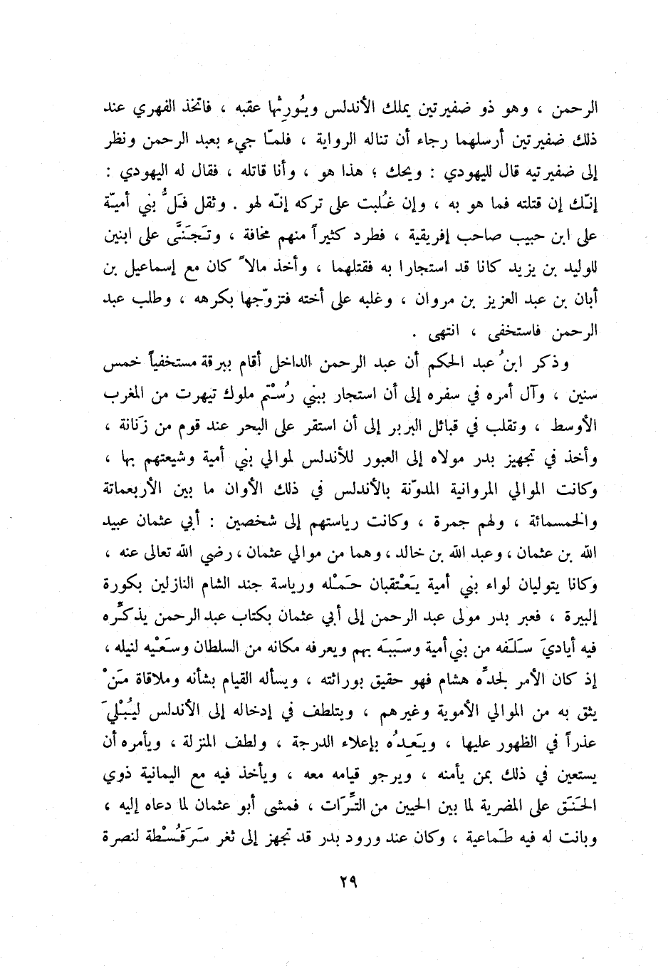 الرحمن، وهو ذو ضفيرتين يملك الأندلس ويورثها عقبه، فاتخذ الفهري عند ذلك ضفيرتين أرسلهما رجاء أن تناله الرواية، فلما جيء بعبد الرحمن ونظر إلى ضفيرتيه قال لليهودي: ويحك، هذا هو، وأنا قاتله، فقال له اليهودي: إنك إن قتلته فما هو به، وإن غلبت عن تركه إنه لهو. وثقل فل بني أمية على ابن حبيب صاحب إفريقية، فطرد كثيراً منهم مخافةً، وتجنى على ابنين للوليد بن يزيد كانا قد استجارا به فقتلهما، وأخذ مالاً كان مع اسماعيل ابن أبان بن عبد العزيز ابن مروان، وغلبه على أخته فتزوجها بكرهه، وطلب عبد الرحمن فاستخفى، انتهى.