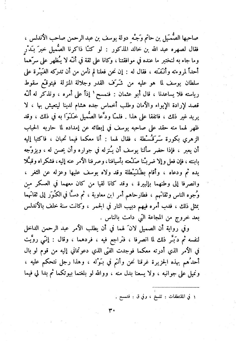 صاحبها الصميل بن حاتم وجه دولة يوسف بن عبد الرحمن صاحب الأندلس، فقال لصهره عبد الله بن خالد المذكور: لو كنا ذاكرنا الصميل خبر بدرٍ وما جاء به لنختبر ما عنده في موافقتنا، وكانا على ثقةٍ في أنه لايظهر على سرهما أحداً لمروءته وأنفته، فقال له: إن نحن فعلنا لم نأمن من أن تدركه الغيرة على سلطان يوسف لما هو عليه من شرف القدر وجلالة المنزلة فيتوقع سقوط رياسته فلا يساعدنا، قال أبو عثمان: فنمسح (1) إذاً على أمره، ونذكر له أنه قصد لإرادة الإيواء والأمان وطلب أخماس جده هشام لدينا ليتعيش بها، لا يريد غير ذلك، فاتفقا على هذا. فلما ودعا الصميل خلوا به في ذلك، وقد ظهر لهما منه حقدٌ على صاحبه يوسف في إبطائه عن إمداده لما حاربه الحباب الزهري بكورة سرقسطة، فقال لهما: أنا معكما فيما تحبان، فاكتبا إليه أن يعبر، فإذا حضر سألنا يوسف أن ينزله في جواره وأن يحسن له، ويزوجه بابنته، فإن فعل وإلا ضربنا صلعته بأسيفنا، وصرفنا الأمر عنه إليه، فشكراه وقبلا يده ثم ودعاه، وأقام بطليطلة وقد ولاه يوسف عليها وعزله عن الثغر، وانصرفا إلى وطنهما بإلبيرة، وقد كانا لقيا من كان معهما في العسكر من وجوه الناس وثقاتهم، فطارحاهم أمر ابن معاوية، ثم دسّا في الكور إلى ثقاتهما بمثل ذلك، فدب أمره فيهم دبيب النار في الجمر، وكانت سنة خلف بالأندلس بعد خروج من المجاعة التي دامت بالناس.