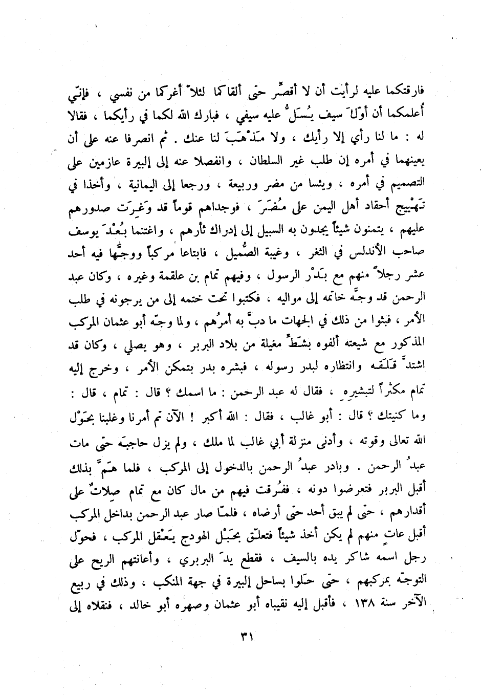 فارقتكما عليه لرأيت أن لا أقصر حتى ألقاكما لئلاّ أغركما من نفسي، فإني أعلمكما أن أول سيف يسلّ عليه سيفي، فبارك الله لكما في رأيكما، فقالا له: ما لنا رأي إلا رأيك، ولا مذهب لنا عنك. ثم انصرفا عنه على أن يعينهما في أمره إن طلب غير السلطان، وانصرفا عنه إلى إلبيرة عازمين على التصميم في أمره، ويئسا من مضر وربيعة، ورجعا إلى اليمانية، وأخذا في تهييج أحقاد أهل اليمن على مضر، فوجداهم قوماً قد وغرت صدورهم عليهم، يتمنون شيئاً يجدون به السبيل إلى إدراك ثأرهم، واغتنما بعد يوسف صاحب الأندلس في الثغر، وغيبة الصميل، فابتاعا مركباً ووجها فيه أحد عشر رجلاً منهم مع بدر الرسول، وفيهم تمام بن علقمة وغيره، وكان عبد الرحمن قد وجه خاتمه إلى مواليه، فكتبوا تحت ختمه إلى من يرجونه في طلب الأمر، فبثوا من ذلك في الجهات مادبّ به أمرهم، ولما وجه أبو عثمان المركب المذكور مع شيعته ألفوه بشطّ مغيلة من بلاد البربر، وهو يصلي، وكان قد اشتد قلقه وانتظاره لبدر رسوله، فبشره بدر بتمكن الأمر، وخرج إليه تمام مكثراً لتبشيره، فقال له عبد الرحمن: ما اسمك قال: تمام، قال: وما كنيتك قال: أبو غالب، فقال: الله أكبر! الآن تمّ أمرنا وغلبنا بحول الله تعالى وقوته، وأدنى منزلة أبي غالب لما ملك، ولم يزل حاجبه حتى مات عبد الرحمن. وبادر عبد الرحمن بالدخول إلى المركب، فلما هم بذلك أقبل البربر فتعرضوا دونه، ففرقت فيهم من مال كان مع تمام صِلاتٌ على أقدارهم، حتى لم يبق أحد حتى أرضاه، فلما صار عبد الرحمن بداخل المركب أقبل عاتٍ منهم لم يكن أخذ شيئاً فتعلق بحبل الهودج يعقل المركب، فحول رجل اسمه شاكر يده بالسيف، فقطع يد البربري، وأعانتهم الريح على التوجه بمركبهم، حتى حلوا بساحل إلبيرة في جهة المنكب، وذلك في ربيع الآخر سنة 138، فأقبل إليه نقيباه أبو عثمان وصهره أبو خالد، فنقلاه إلى