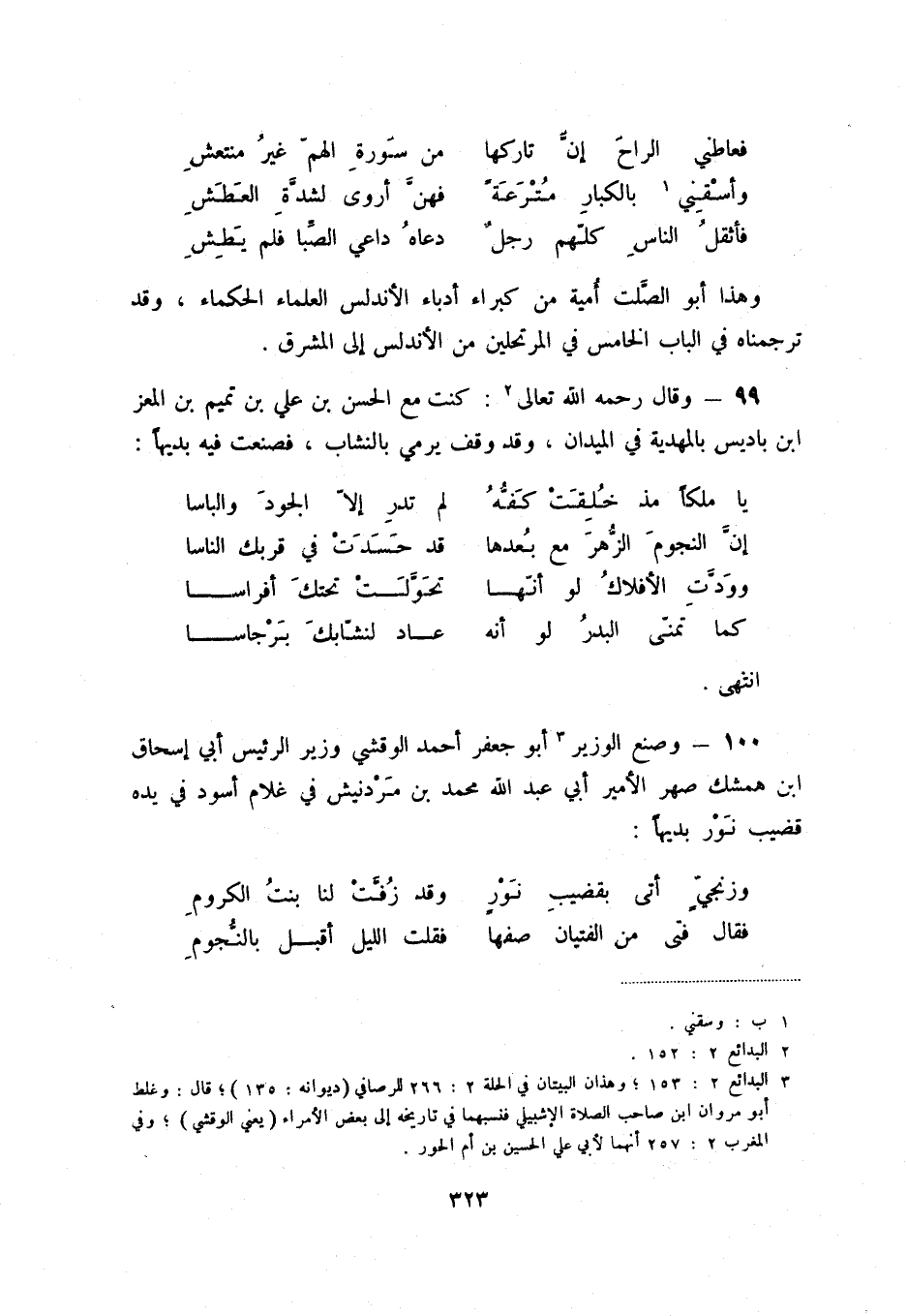 (3) البدائع 2: 153؛ وهذان البيتان في الحلة 2: 266 للرصافي (ديوانه: 135) ؛ قال: وغلط أبو مروان ابن صاحب الصلاة الإشبيلي فنسبهما في تاريخه إلى بعض الأمراء (يعني الوقشي) ، وفي المغرب 2: 257 أنهما لأبي الحسين بن أم الحور.