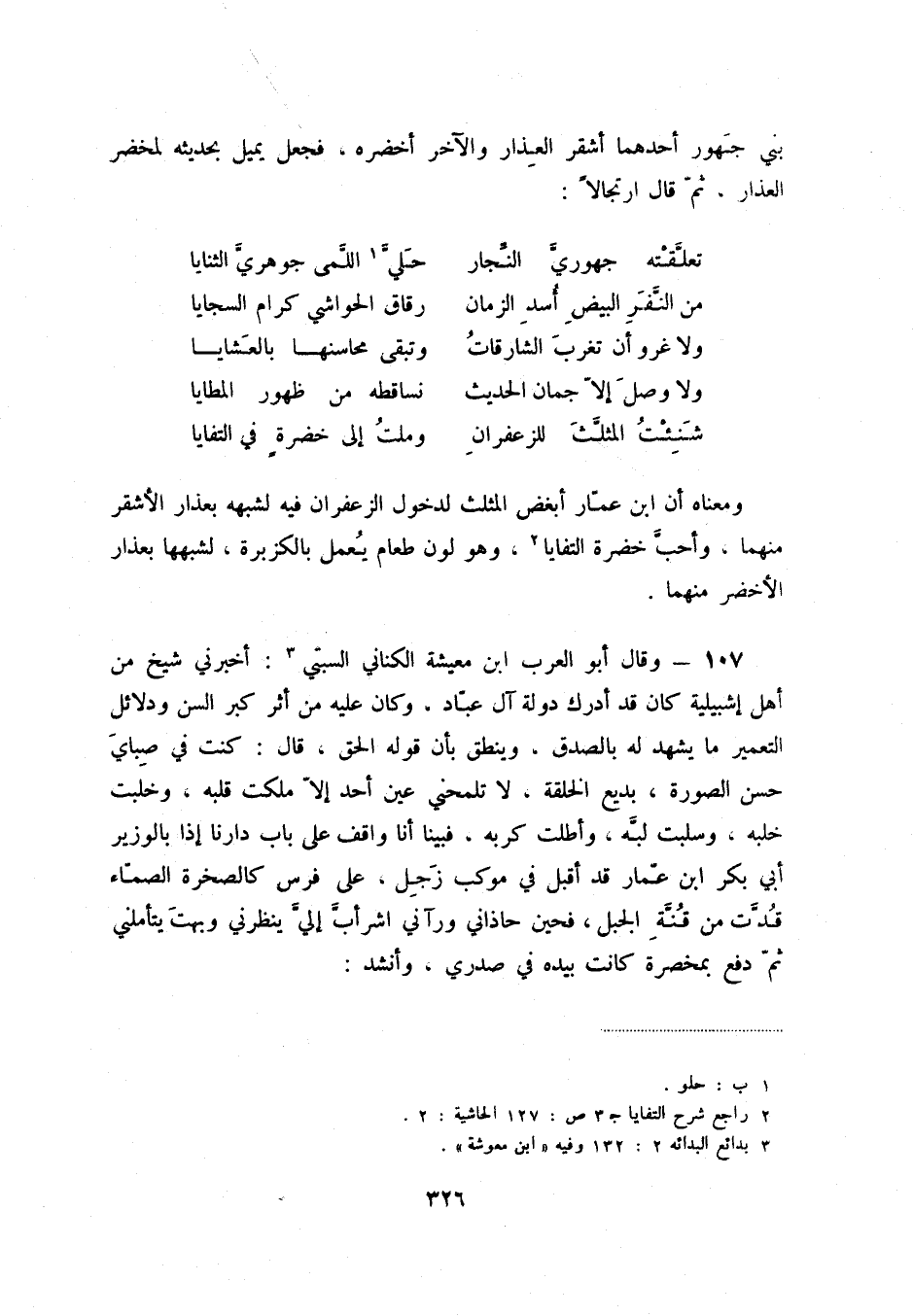 شنأت المثلّث للزعفران ... وملت إلى خضرةٍ في التفايا ومعناه أن ابن عمّار أبغض المثلّث لدخول الزعفران فيه لشبهه بعذار الأشقر منهما، وأحبّ خضرة التفايا (2) ، وهو لون طعام يعمل بالكزبرة، لشبهها بعذار الأخضر منهما.