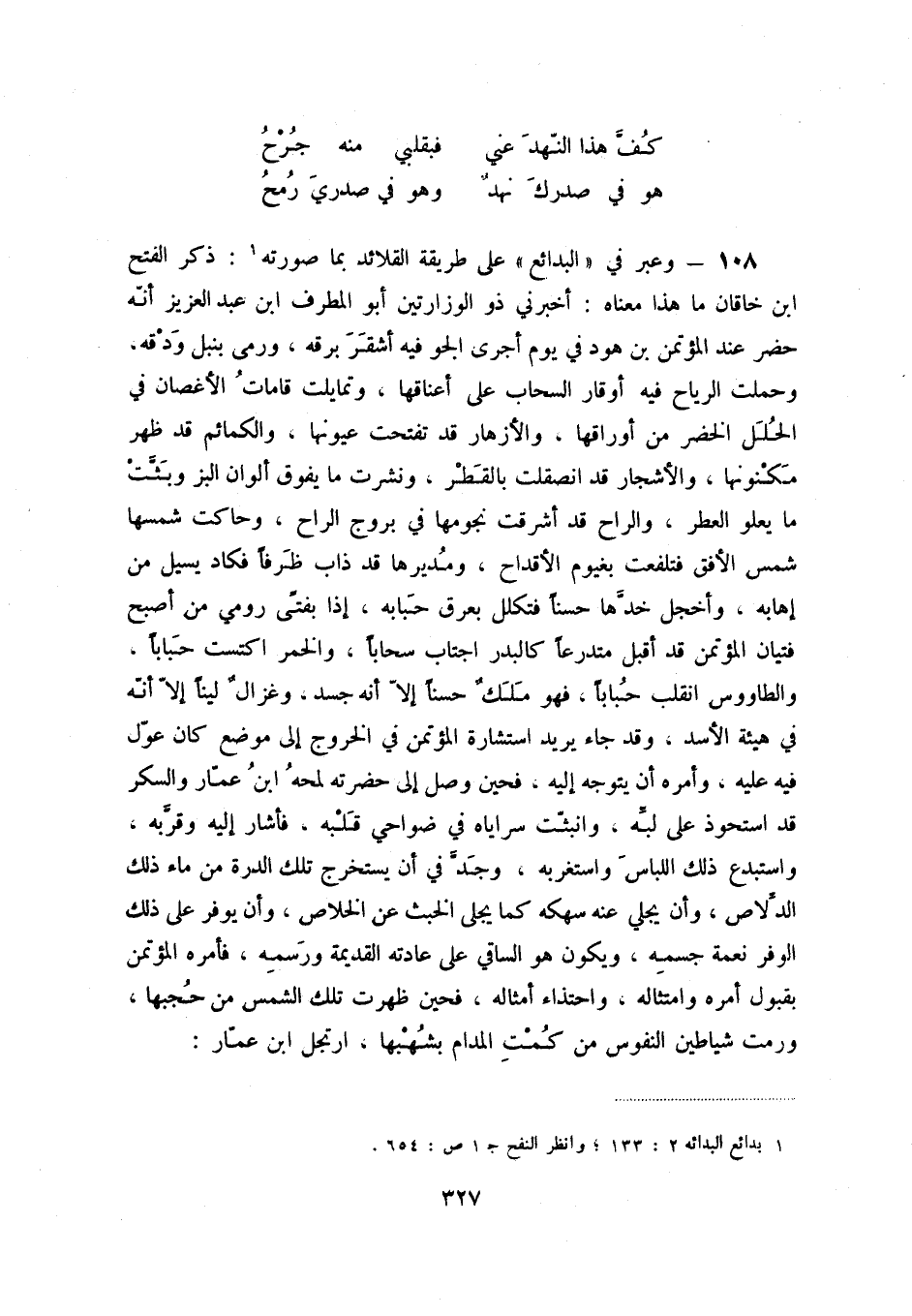 هو في صدرك نهدٌ ... وهو في صدري رمح 108 - وعبر في البدائع على طريقة القلائد بما صورته (1) : ذكر الفتح بن خاقان ما هذا معناه: أخبرني ذو الوزارتين أبو مطرف ابن عبد العزيز أنّه حضر عند المؤتمن بن هود في يوم أجرى الجو فيه أشقر برقه، ورمى بنبل ودقه، وحملت الرياح فيه أوقار السحاب على أعناقها، وتمايلت قامات الأغصان في الحلل الخضر من أوراقها، والأزهار قد تفتحت عيونها، والكمائم قد ظهر مكنونها، والأشجار قد انصقلت بالقطر، ونشرت ما يفوق ألوان البزّ وبثّت ما يعلو العطر، والراح قد أشرقت نجومها في بروج الراح، وحاكت شمسها شمس الأفق فتلفعت بغيوم الأقداح، ومديرها قد ذاب ظرفاً فكاد يسيل من إهابه، وأخجل خدّها حسناً فتكلل بعرق حبابه، إذا بفتىً رومي من أصبح فتيان المؤتمن قد أقبل متدرعاً كالبدر اجتاب سحاباً، والخمر اكتست حباباً، والطاووس انقلب حباباً، فهو ملكٌ حسناً إلاّ أنه جسد، وغزالٌ ليناً إلاّ أنّه في هيئة الأسد، وقد جاء يريد استشارة المؤتمن في الخروج إلى موضع كان عوّل فيه عليه، وأمره أن يتوجه إليه، فحين وصل إلى حضرته لمحه ابن عمّار والسكر قد استحوذ على لبّه، وانبثّت سراياه في ضواحي قلبه، فأشار إليه وقرّبه، واستبدع ذلك اللباس واستغربه، وجدّ في أن يستخرج تلك الدرة من ماء ذلك الدّلاص، وأن يجلي عنه سهكه كما يجلى الخبث عن الخلاص، وأن يوفر على ذلك الوفر نعمة جسمه، ويكون هو الساقي على عادته القديمة ورسمه، فأمره المؤتمن بقبول أمره وامتثاله، واحتذاء أمثاله، فحين ظهرت تلك الشمس من حجبها، ورمت شياطين النفوس من كمت المدام بشهبها، ارتجل ابن عمّار: