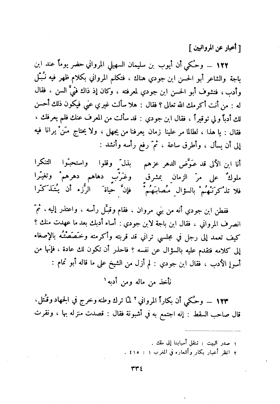 122 - وحكي أن أيوب بن سليمان السهيلي المرواني حضر يوماً عند ابن باجة والشاعر أبو الحسن ابن جودي هناك، فتكلم المرواني بكلام ظهر فيه نبل وأدب، فتشوف أبو الحسن ابن جودي لمعرفته، وكان إذ ذاك فتيّ السن، فقال له: من أنت أكرمك الله تعالى فقال: هلا سألت غيري عني فيكون ذلك أحسن لك أدباً ولي توقيراً، فقال ابن جودي: قد سألت من المعرف عنك فلم يعرفك، فقال: يا هذا، لطالما مر علينا زمان يعرفنا من يجهل، ولا يحتاج من يرانا فيه إلى أن يسأل، وأطرق ساعة، ثمّ رفع رأسه وأنشد: