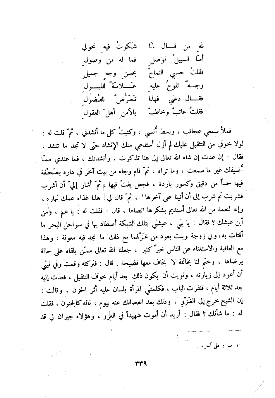 فقلت عاتب وخاطب ... بالأمن أهل العقول فملأ سمعي عجائب، وبسط أنسي، وكتبت كل ما أنشدني، ثمّ قلت له: لولا خوفي من التثقيل عليك لم أزل أستدعي منك الإنشاد حتّى لا تجد ما تنشد، فقال: إن عدت إن شاء الله تعالى إلى هنا تذكرت، وأنشدتك، فما عندي ممّا أضيفك غير ما سمعت، وما تراه، ثمّ قام وجاء من بيت آخر في داره بصحفة فيها حساً من دقيق وكسور باردة، فجعل يفتّ فيها، ثمّ أشار إليّ أن أشرب فشبت ثم شرب إلى أن أتينا على آخرها (1) ، ثمّ قال لي: هذا غذاء عمك نهاره، وإنه لنعمة من الله تعالى أستديم بشكرها اتصالها، قال: فقلت له: يا عم، ومن أين عيشك فقال: يا بني، عيشي بتلك الشبكة أصطاد بها في سواحل البحر ما أقتات به، ولي زوجة وبنت يعود من غزلهما مع ذلك ما نجد فيه معونة، وهذا مع العافية والاستغناء عن النّاس خيرٌ كثير، جعلنا الله تعالى ممّن يلقاه على حالة يرضاها، وختم لنا بخاتمة لا يخاف معها فضيحة. قال: فتركته وقمت وفي نيّتي أن أعود إلى زيارته، ونويت أن يكون ذلك بعد أيّام خوف التثقيل، فعدت إليه بعد ثلاثة أيّام، فنقرت الباب، فكلمتني المرأة بلسان عليه أثر حزن، وقالت: إن الشيخ خرج إلى الغزو، وذلك بعد انفصالك عنه بيوم، ناله كالجنون، فقلت له: ما شأنك فقال: أريد أن أموت شهيداً في الغزو، وهؤلاء جيران لي قد