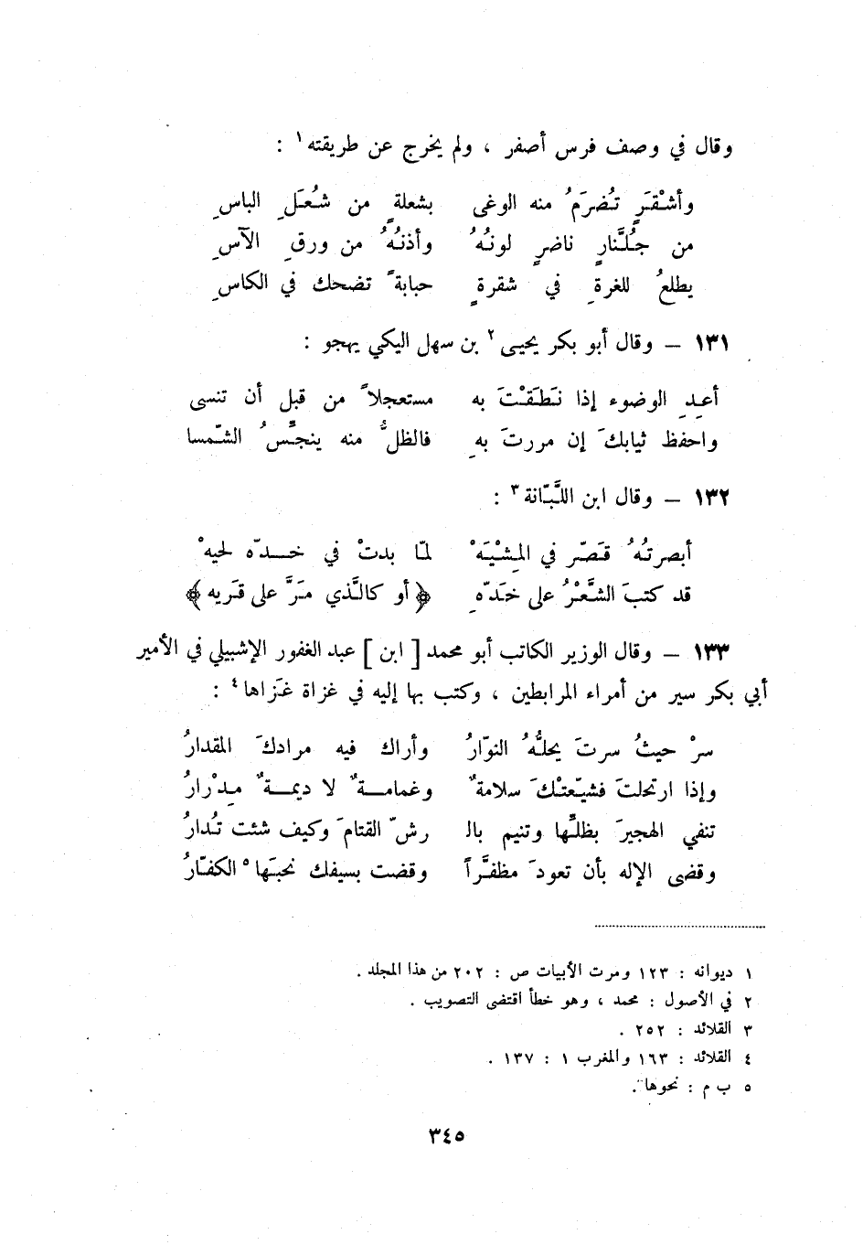 قد كتب الشّعر على خدّه ... " أو كالّذي مرّ على قريه " 133 - وقال الوزير الكاتب أبو محمد [ابن] عبد الغفور الإشبيلي في الأمير أبي بكر سير من أمراء المرابطين، وكتب بها إليه في غزاة غزاها (4) :