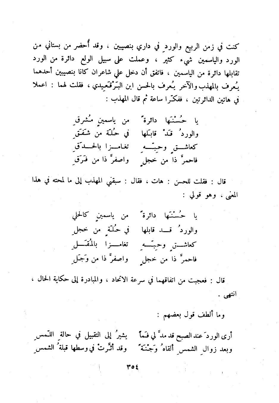 كنت في زمن الربيع والورد في داري بنصيبين، وقد أحضر من بستاني من الورد والياسمين شيء كثير، وعملت على سبيل الولع دائرة من الورد تقابلها دائرة من الياسمين، فاتفق أن دخل علي شاعران كانا بنصيبين أحدهما يعرف بالمهذب والآخر يعرف بالحسن ابن البرقعيدي، فقلت لهما: اعملا في هاتين الدائرتين، ففكرّا ساعة ثمّ قال المهذب: