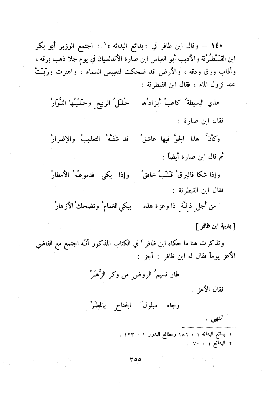140 - وقال ابن ظافر في " بدائع البدائه " (1) : اجتمع الوزير أبو بكر ابن القبطرنة والأديب أبو العباس ابن صارة الأندلسيان في يوم جلا ذهب برقه، وأذاب ورق ودقه، والأرض قد ضحكت لتعبيس السماء، واهتزت وربت عند نزول الماء، فقال ابن القبطرنة: