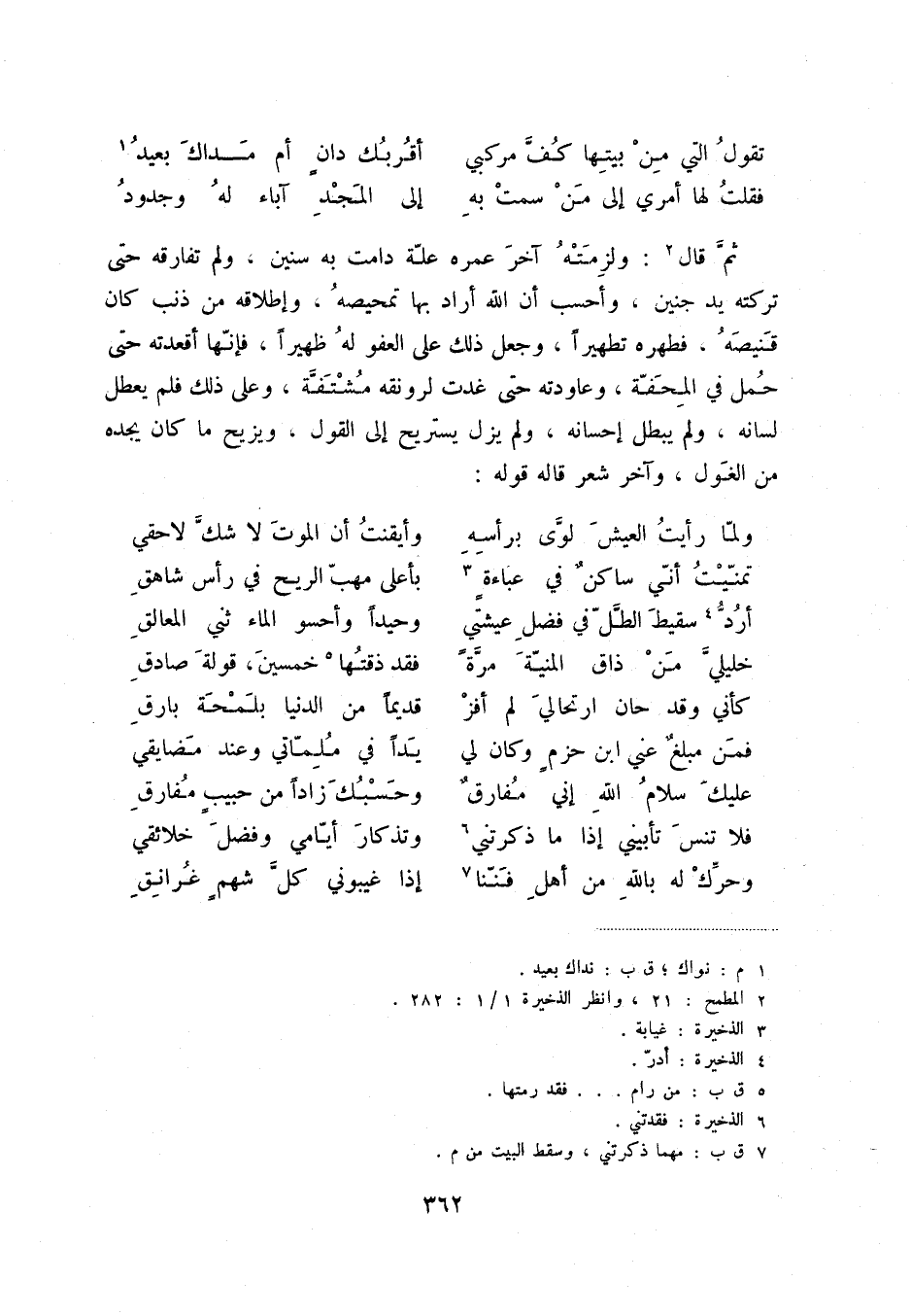 فقلت لها أمري إلى من سمت به ... إلى المجد آباء له وجدود ثمّ قال (2) : ولزمته آخر عمره علّة دامت به سنين، ولم تفارقه حتّى تركته يد جنين، وأحسب أن الله أراد بها تمحيصه، وإطلاقه من ذنب كان قنيصه، فطهره تطهيراً، وجعل ذلك على العفو له ظهيراً، فإنّها أقعدته حتّى حمل في المحفّة، وعاودته حتّى غدت لرونقه مشتفّة، وعلى ذلك فلم يعطل لسانه، ولم يبطل إحسانه، ولم يزل يستريح إلى القول، ويزيح ما كان يجده من الغول، وآخر شعر قاله قوله: