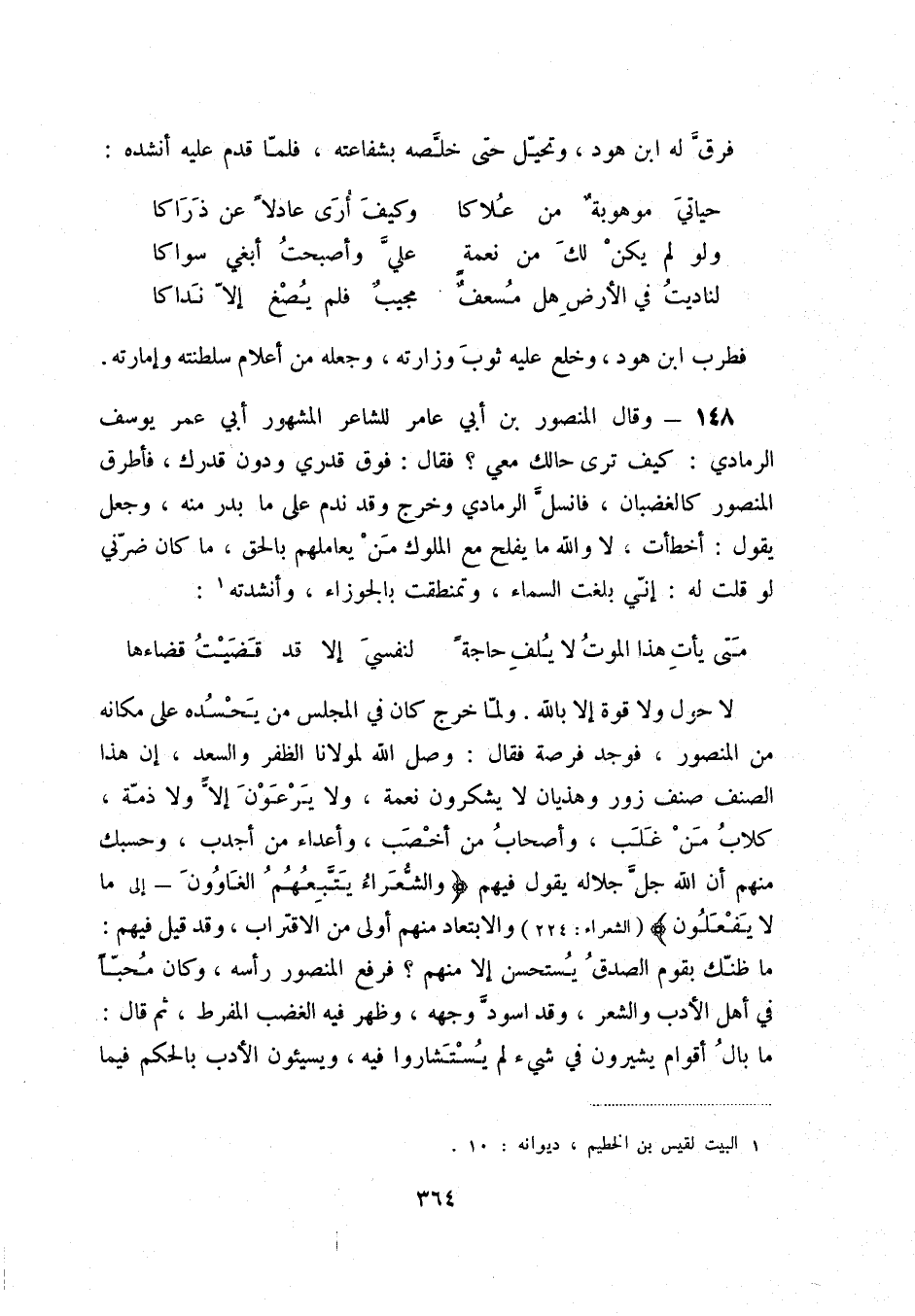 148 - وقال المنصور بن أبي عامر للشاعر المشهور أبي عمر يوسف الرمادي: كيف ترى حالك معي فقال فوق قدري ودون قدرك، فأطرق المنصور كالغضبان، فانسلّ الرمادي وخرج وقد ندم على ما بدر منه، وجعل يقول: أخطأت، لا والله ما يفلح مع الملوك من يعاملهم بالحق، ما كان ضرّني لو قلت له: إنّي بلغت السماء، وتمنطقت بالجوزاء، وأنشدته (1) :