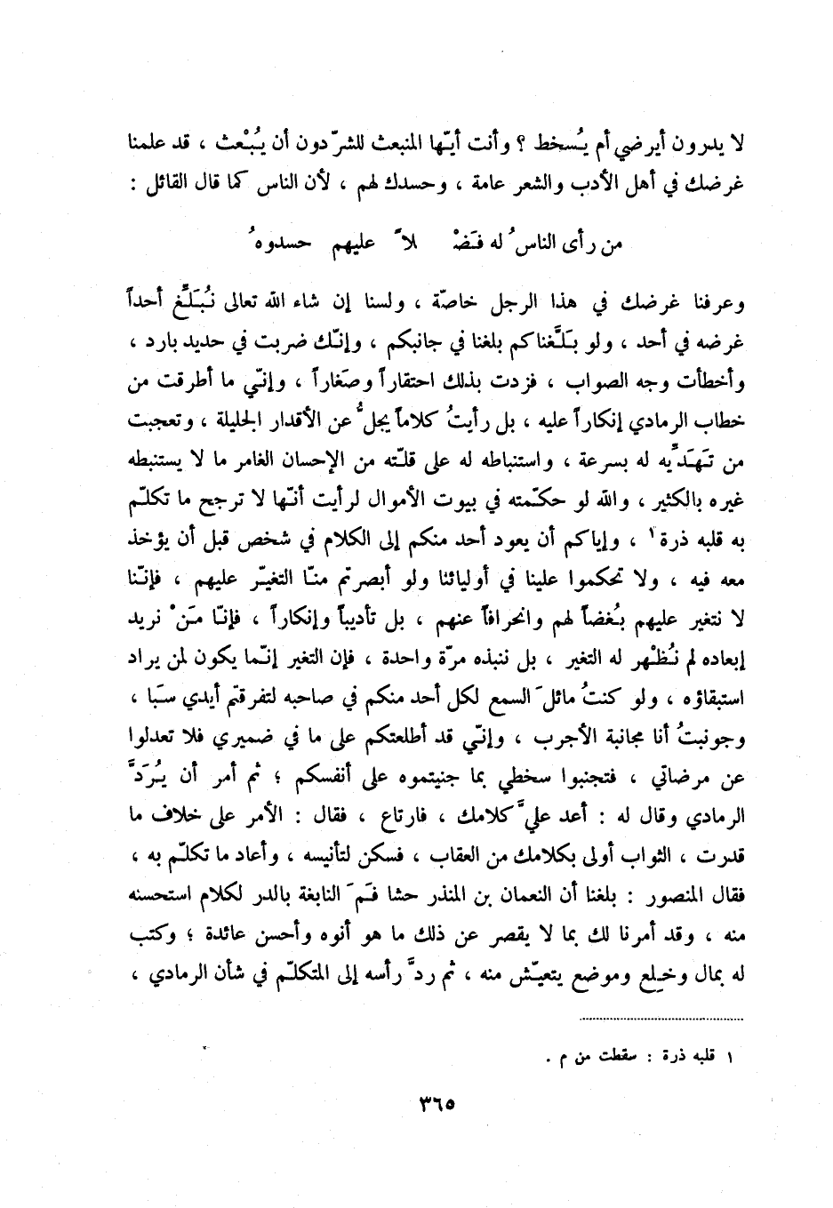 من رأى الناس له فض ... لاً عليهم حسدوه وعرفنا غرضك في هذا الرجل خاصّة، ولسنا إن شاء الله تعالى نبلّغ أحداً غرضه في أحد، ولو بلّغناكم بلغنا في جانبكم، وإنّك ضربت في حديد بارد، وأخطأت وجه الصواب، فزدت بذلك احتقاراً وصغاراً، وإنّي ما أطرقت من خطاب الرمادي إنكاراً عليه، بل رأيت كلاماً يجلّ عن الأقدار الجليلة، وتعجبت من تهدّيه له بسرعة، واستنباطه له على قلّته من الإحسان الغامر ما لا يستنبطه غيره بالكثير، والله لو حكّمته في بيوت الأموال لرأيت أنّها لا ترجح ما تكلّم به قلبه ذرة (1) ، وإيّاكم أن يعود أحد منكم إلى الكلام في شخص قبل أن يؤخذ معه فيه، ولا تحكموا علينا في أوليائنا ولو أبصرتم منّا التغيّر عليهم، فإنّنا لا نتغير عليهم بغضاً لهم وانحرافاً عنهم، بل تأديباً وإنكاراً، فإنّا من نريد إبعاده لم نظهر له التغير، بل ننبذه مرّة واحدة، فإن التغير إنّما يكون لمن يراد استبقاؤه، ولو كنت مائل السمع لكل أحد منكم في صاحبه لتفرقتم أيدي سبا، وجونبت أنا مجانبة الأجرب، وإنّي قد أطلعتكم على ما في ضميري فلا تعدلوا عن مرضاتي، فتجنبوا سخطي بما جنيتموه على أنفسكم؛ ثمّ أمر أن يردّ الرمادي وقال له: أعد عليّ كلامك، فارتاع، فقال: الأمر على خلاف ما قدرت، الثواب أولى بكلامك من العقاب، فسكن لتأنيسه، وأعاد ما تكلّم به، فقال المنصور: بلغنا أن النعمان بن المنذر حشا فم النابغة بالدر لكلام استحسنه منه، وقد أمرنا لك بما لا يقصر عن ذلك ما هو أنوه وأحسن عائدة؛ وكتب له بمال وخلع وموضع يتعيّش منه، ثمّ ردّ رأسه إلى المتكلّم في شأن الرمادي،