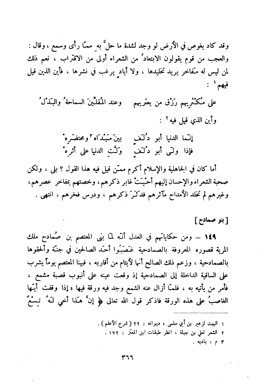 فإذا ولّى أبو دلفٍ ... ولّت الدنيا على أثره أما كان في الجاهلية والإسلام أكرم ممّن قيل فيه هذا القول بلى، ولكن صحبة الشعراء والإحسان إليهم أحيت غابر ذكرهم، وخصتهم بمفاخر عصرهم، وغيرهم لم تخلد الأمداح مآثرهم فدثر ذكرهم، ودرس فخرهم، انتهى.