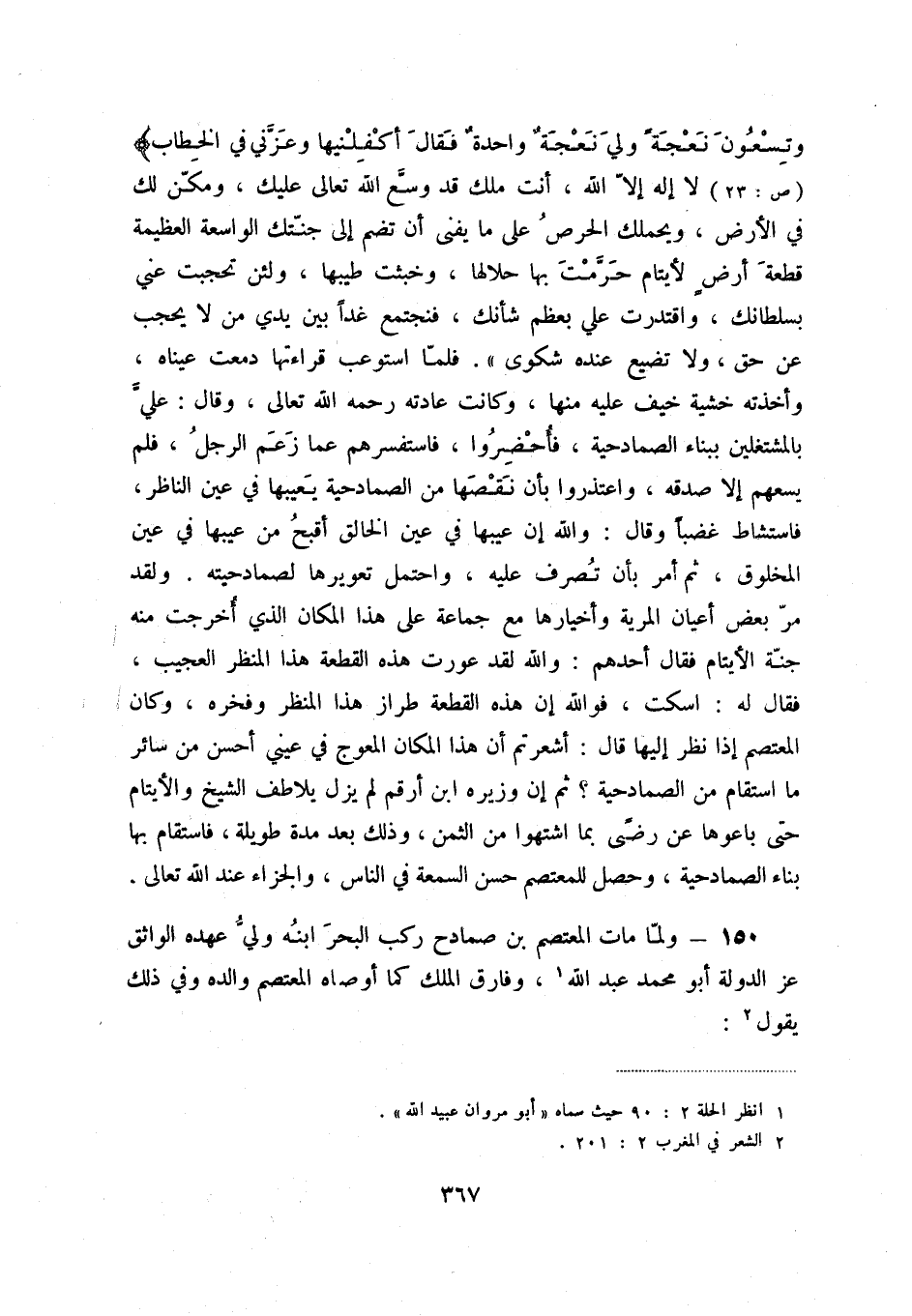 فلمّا استوعب قراءتها دمعت عيناه، وأخذته خشية خيف عليه منها، وكانت عادته رحمه الله تعالى، وقال: عليّ بالمشتغلين ببناء الصمادحية، فأحضروا، فاستفسرهم عمّا زعم الرجل، فلم يسعهم إلاّ صدقه، واعتذروا بأن نقصها من الصمادحية يعيبها في عين الناظر، فاستشاط غضباً وقال: والله إنّ عيبها في عين الخالق أقبح من عيبها في عين المخلوق، ثمّ أمر بأن تصرف عليه، واحتمل تعويرها لصمادحيته. ولقد مرّ بعض أعيان المرية وأخيارها مع جماعة على هذا المكان الذي أخرجت منه جنّة الأيتام فقال أحدهم: والله لقد عورت هذه القطعة هذا المنظر العجيب، فقال له: اسكت، فوالله إنّ هذه القطعة طراز هذا المنظر وفخره، وكان المعتصم إذا نظر إليها قال: أشعرتم أنّ هذا المكان المعوج في عيني أحسن من سائر ما استقام من الصمادحية ثمّ إن وزيره ابن أرقم لم يزل يلاطف الشيخ والأيتام حتّى باعوها عن رضىً بما اشتهوا من الثمن، وذلك بعد مدة طويلة، فاستقام بها بناء الصمادحية، وحصل للمعتصم حسن السمعة في الناس، والجزاء عند الله تعالى.