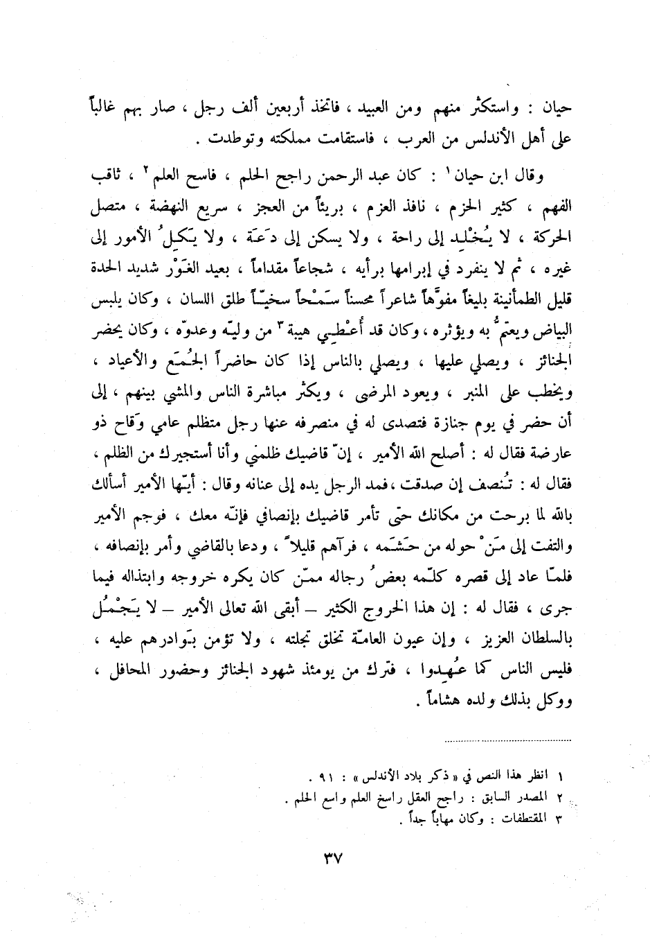 حيان: واستكثر منهم ومن العبيد، فاتخذ أربعين ألف رجل، صار بهم غالباً على أهل الأندلس من العرب، فاستقامت مملكته وتوطدت.