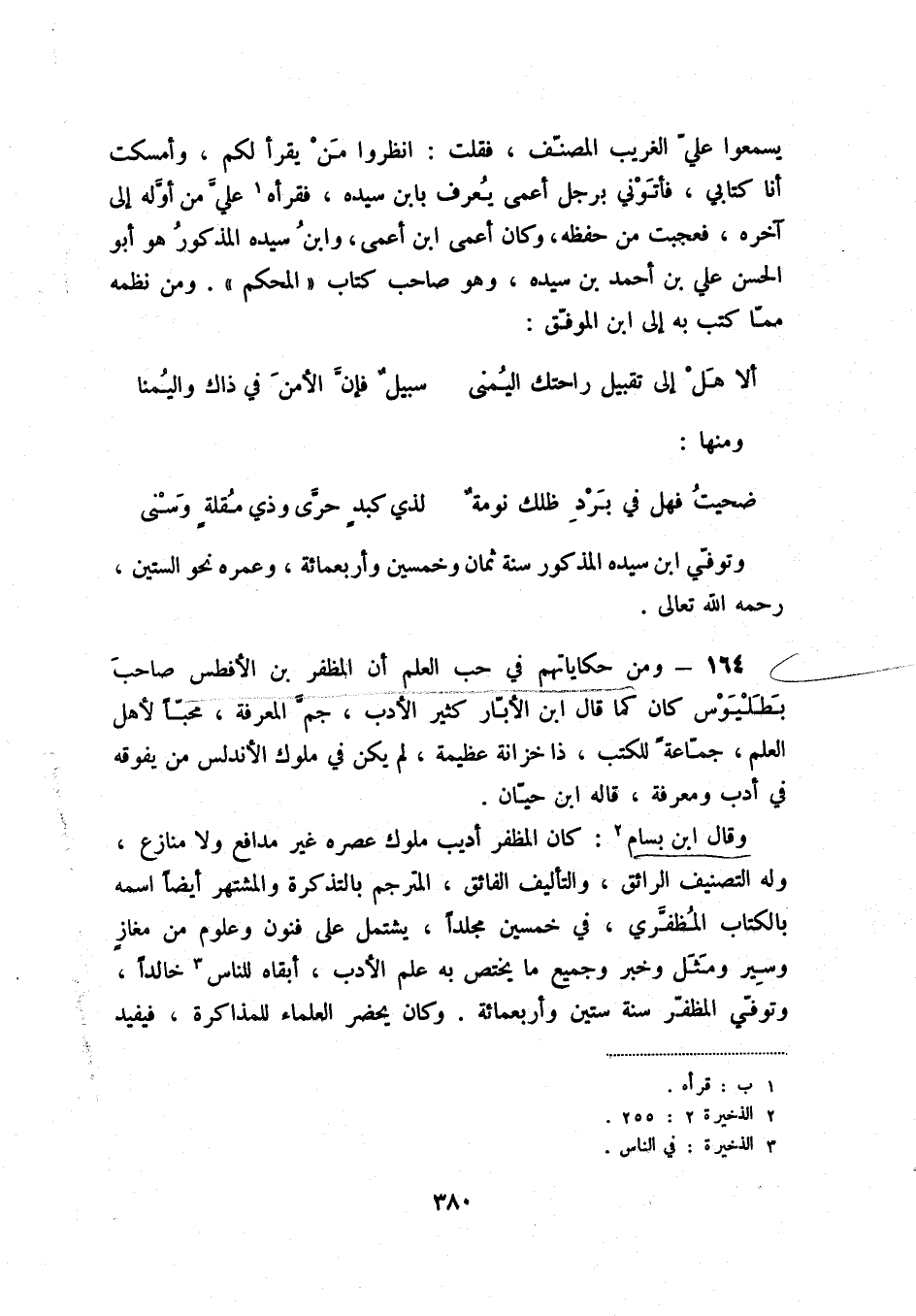 164 - ومن حكاياتهم في حب العلم أن المظفر بن الأفطس صاحب بطليوس كان كما قال ابن الأبار كثير الأدب، جم المعرفة، محباً لأهل العلم، جماعةً للكتب، ذا خزانة عظيمة، لم يكن في ملوك الأندلس من يفوقه في أدب ومعرفة، قاله ابن حيان.